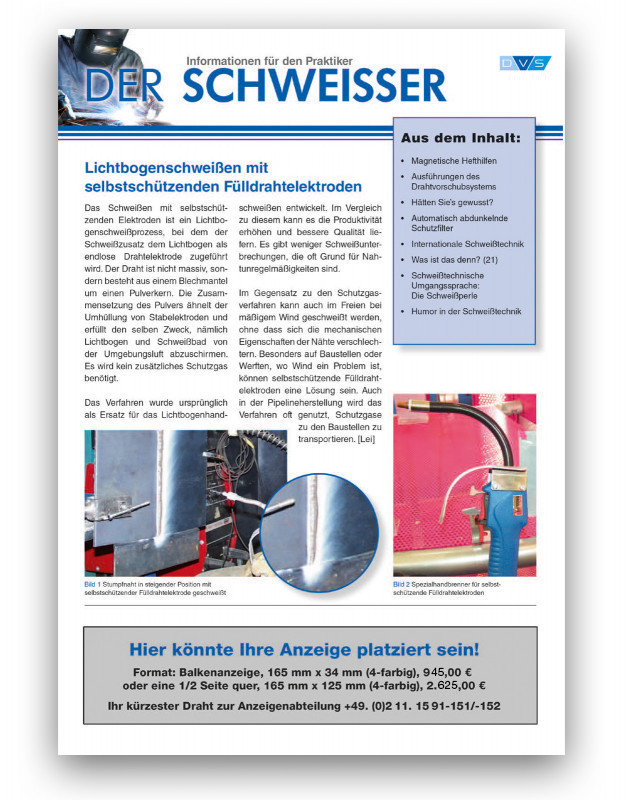 With short and precise information, tips and hints for daily work, ‘DER SCHWEISSER’ is aimed at the ‘welder on site’ as well as at the training and further education participants of the DVS training centres. Our specialist editorial team focuses in particular on