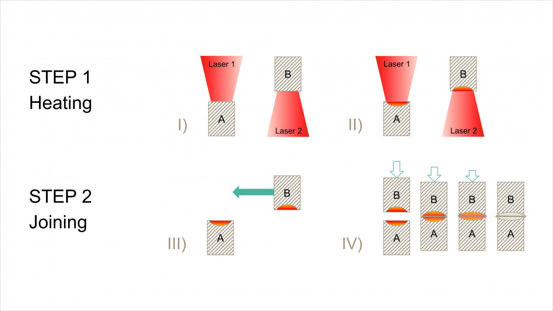 Bei diesem Schweißverfahren werden beide Bauteile im ersten Schritt getrennt voneinander oberflächlich aufgeschmolzen und erst im zweiten Schritt zusammengesetzt und miteinander verpresst. Der Einsatz von materialgleichen Komponenten ermöglicht eine größere Auswahl an Kunststoffen. So können auch Bauteile aus dem gleichen Spritzwerkzeug verwendet werden, da die Eigenschaft „lasertransparent“ nicht notwendig ist. Die Vorteile des Laserschweißens bleiben unabhängig vom eingesetzten Verfahren erhalten. So erfolgt die Wärmeeinbringung punktuell und kontrolliert, sodass die Nahtbreite sowie die Schmelztiefe sehr genau definiert werden können.
