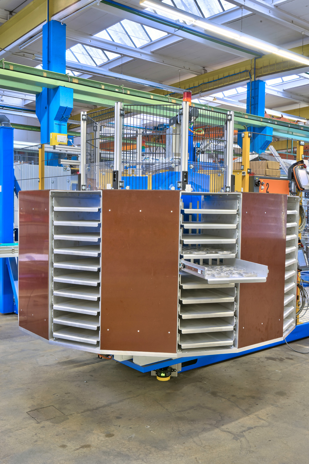 Wenn man über Personalbindung nachdenkt, ist der maßgebliche Eingriff durch den Operator bei der Bestückung des Rundtaktmagazins zu finden. Hier werden die Griffe in labilen Tiefziehfolien in die Magazinfächer eingefüllt. Da jeder dieser sogenannten „Trays“ bis zu zwölf Griffe fasst und das Magazin 80 Trays aufnehmen kann, entsteht ein Aufnahmevolumen von 960 Griffen. Das Magazin ist bewusst in den Eckbereich der Anlage integriert. So sind zirka ein Viertel im geschützten Bereich der Anlage, und zirka drei Viertel des Aufnahmevolumens können online vom Operator nachgefüllt werden.