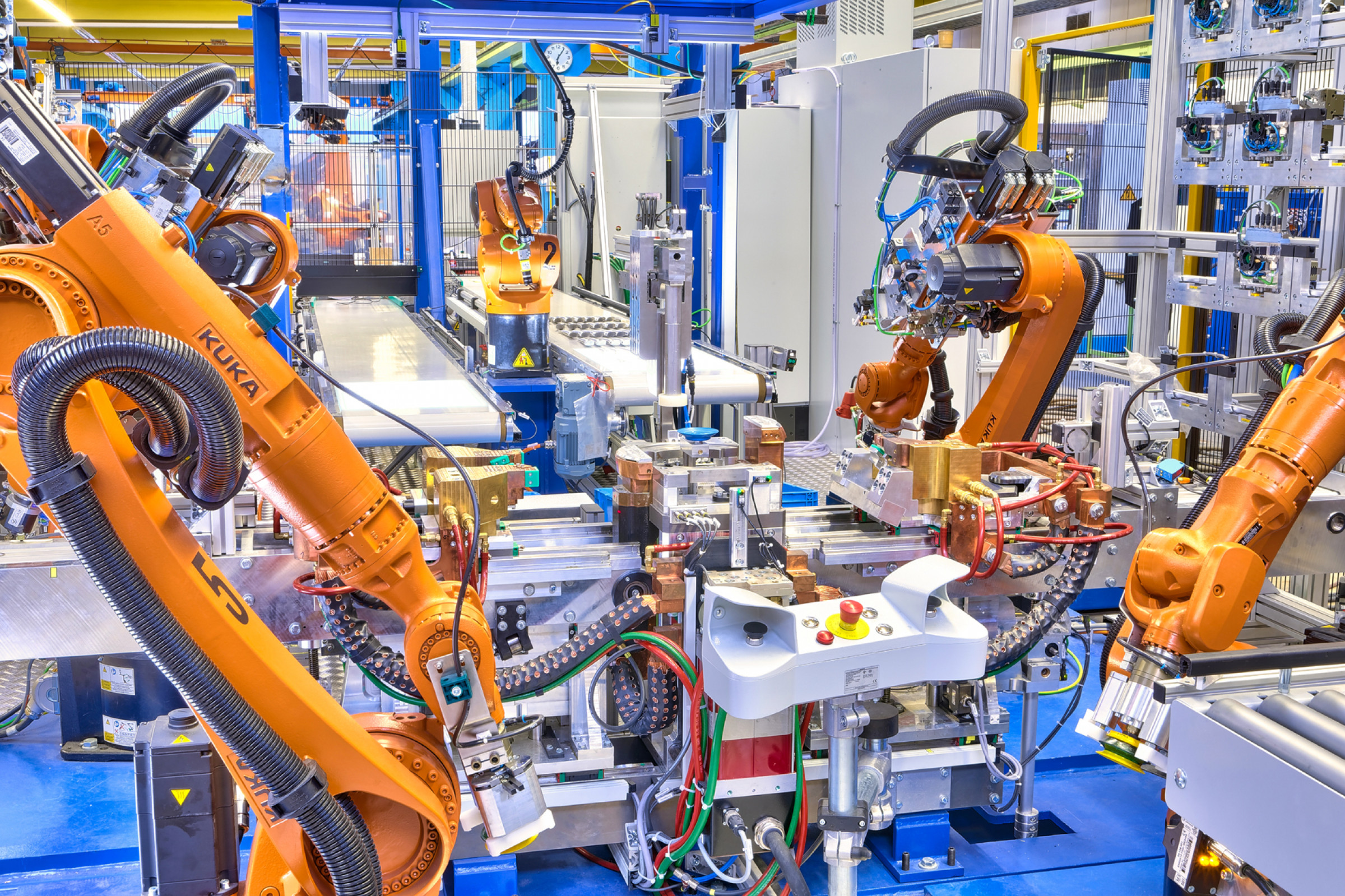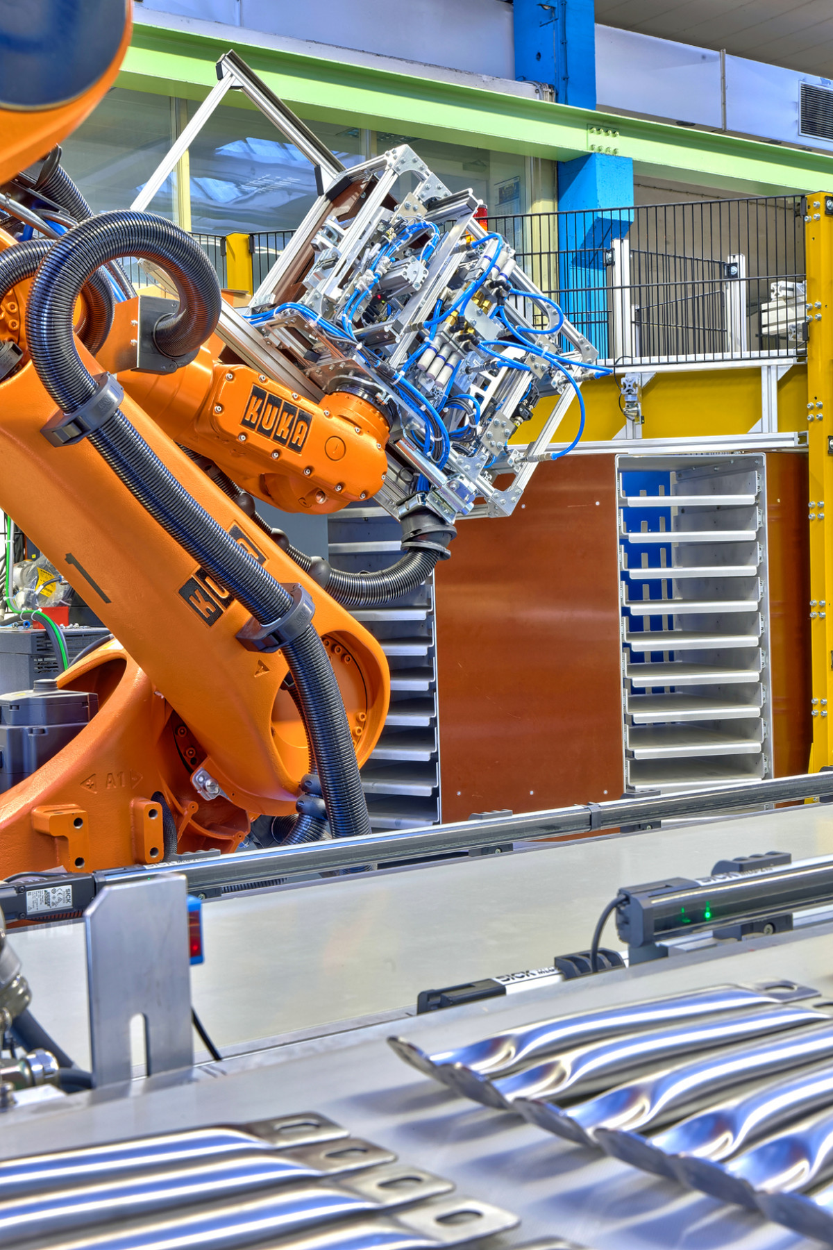 Mit der Anlage wird immer eine Topffamilie verarbeitet, zum Beispiel zylindrische Töpfe in den Durchmessern 160, 200 und 240 mm, zusammen mit einem Grifftyp. Dabei wird die Zuordnung von Topf zu Griff über die Anlagensteuerung verwaltet. Der Bediener ruft eine Rezeptur am Bedien-Tableau auf, und die Anlage stellt sich automatisch auf Topfdurchmesser, Winkellage des Griffes und Kameravorgaben für die Erkennung der Griffe ein. Zudem holen sich die Roboter automatisch die zugehörigen Greifer aus dem Greiferbahnhof und parken dort die nicht mehr benötigten Greifersysteme. Lediglich bestimmte Schweißwerkzeuge muss der Bediener vor Produktionsstart prozessbedingt umrüsten.