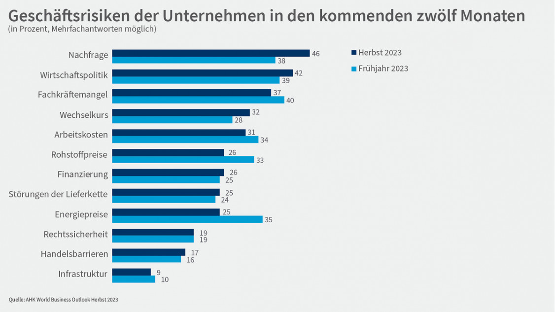 Mit 46 Prozent der Nennungen ist auch weltweit für Unternehmen eine geringe Nachfrage das zentrale Geschäftsrisiko. Risiken im Zusammenhang mit der restriktiven Geldpolitik – wie schwankende Wechselkurse und Herausforderungen bei der Finanzierung – haben zudem leicht zugenommen und stellen damit beachtliche Risiken dar. Angebotsseitige Engpässe wie Lieferkettenstörungen oder hohe Energie- und Rohstoffpreise treten dagegen mittlerweile stärker in den Hintergrund.