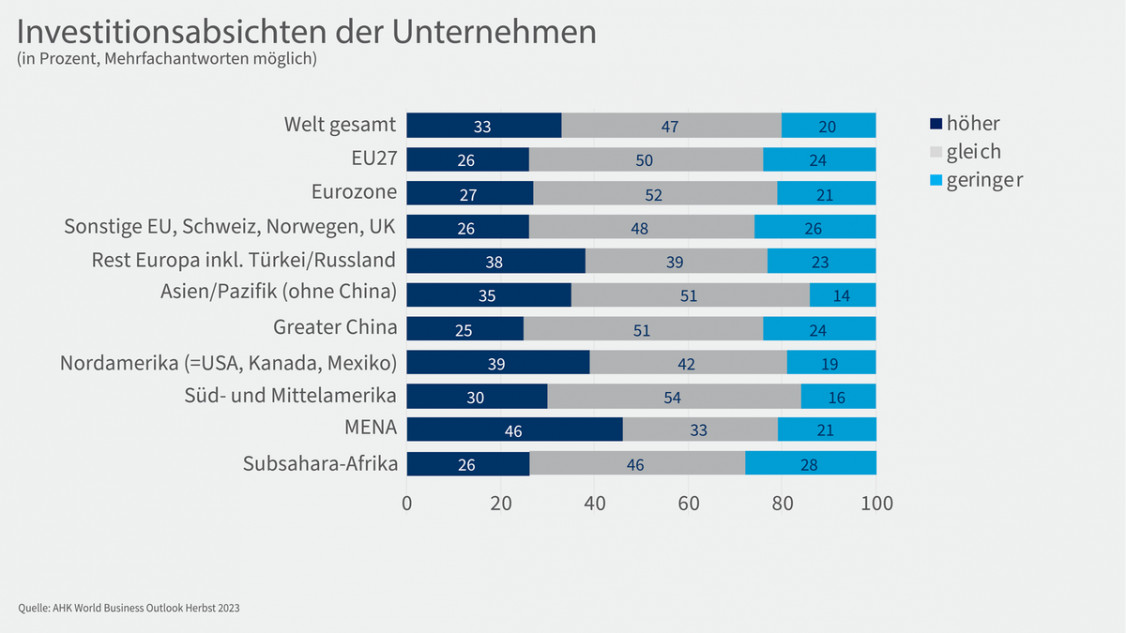 Trotz der weltweiten Krisen, aber auch angesichts großer struktureller Probleme an heimischen Standorten weiten deutsche Unternehmen im Ausland ihre Investitionen dort aus. Ein Drittel der Unternehmen (33 Prozent) plant in den kommenden zwölf Monaten höhere Investitionen (Frühjahr 36 Prozent), während ein Fünftel (20 Prozent) weniger investieren möchte (Frühjahr 17 Prozent). Insbesondere in Nordamerika, der MENA-Region und im Asien-Pazifik-Raum (ohne Greater China) planen die Unternehmen mit höheren Investitionsbudgets. In Europa und China zeigen sich die Unternehmen hingegen zurückhaltender.