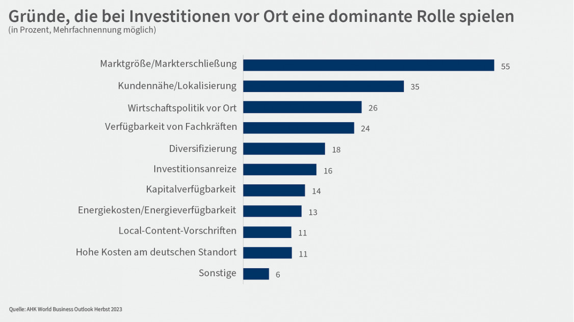 Während die Marktgröße und Markterschließung für über die Hälfte der Unternehmen (55 Prozent) sowie die Kundennähe und Lokalisierung (35 Prozent) die Hauptgründe für Investitionen an ihren internationalen Standorten sind, spielen auch die Diversifizierung (18 Prozent) und Investitionsanreize (16 Prozent) für einen Teil der Unternehmen bei ihren Auslandsinvestitionen eine erkennbar wichtige Rolle.
