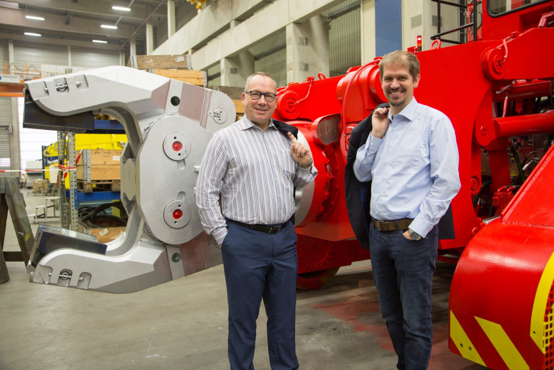 Standardwerkstoff für Zangenkopf und -schenkel von Dango & Dienenthal ist die hochfeste Güte S690QL. „Dieser Werkstoff ist für Schweißbetriebe jedoch eine Herausforderung“, weiß Jan Nell. „Den kann nicht jeder schweißen.“ Rainer Dango ergänzt: „Jebens will uns als Kunde unbedingt zufriedenstellen. Das merkt man in vielerlei Hinsicht.“ Das stellte der Schweißspezialist auch im konkreten Fall unter Beweis: Der benötige Feinkornstahl war bei Jebens bis zu einer Blechdicke von 250 Millimetern lagermäßig verfügbar. Für den Zangenkopf fertigte Jebens eine Baugruppe aus einem nahtlos gewalzten, mechanisch bearbeiteten Ring und einem Brennteil. Dieser flanschartige Ring, an dem die Drehspindel angeschlossen wird, wurde ebenfalls in der Güte S690QL gewalzt. Für andere Bauteile des Zangenkopfes mit weniger kritischen Spannungsverläufen kam hingegen Stahl der Güte S355 zum Einsatz.