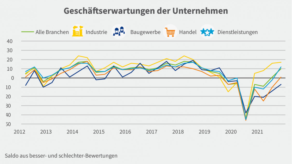 Im Bau und beim Handel verbessern sich die Erwartungen für die kommenden Monate auf niedrigem Niveau: Bei den Bauunternehmen bleiben die Skeptiker wegen der Energie- beziehungsweise Rohstoffpreise und wegen des Fachkräftemangels in der Überzahl (Saldo minus 7 nach zuvor minus 14 Punkten); der Handel erreicht einen Saldo von 1 Punkt nach minus 10 Punkten. Die Dienstleister blicken angesichts wegfallender pandemiebedingter Einschränkungen wieder deutlich optimistischer in die Zukunft als im Frühsommer (12 nach zuvor minus 2 Punkten).