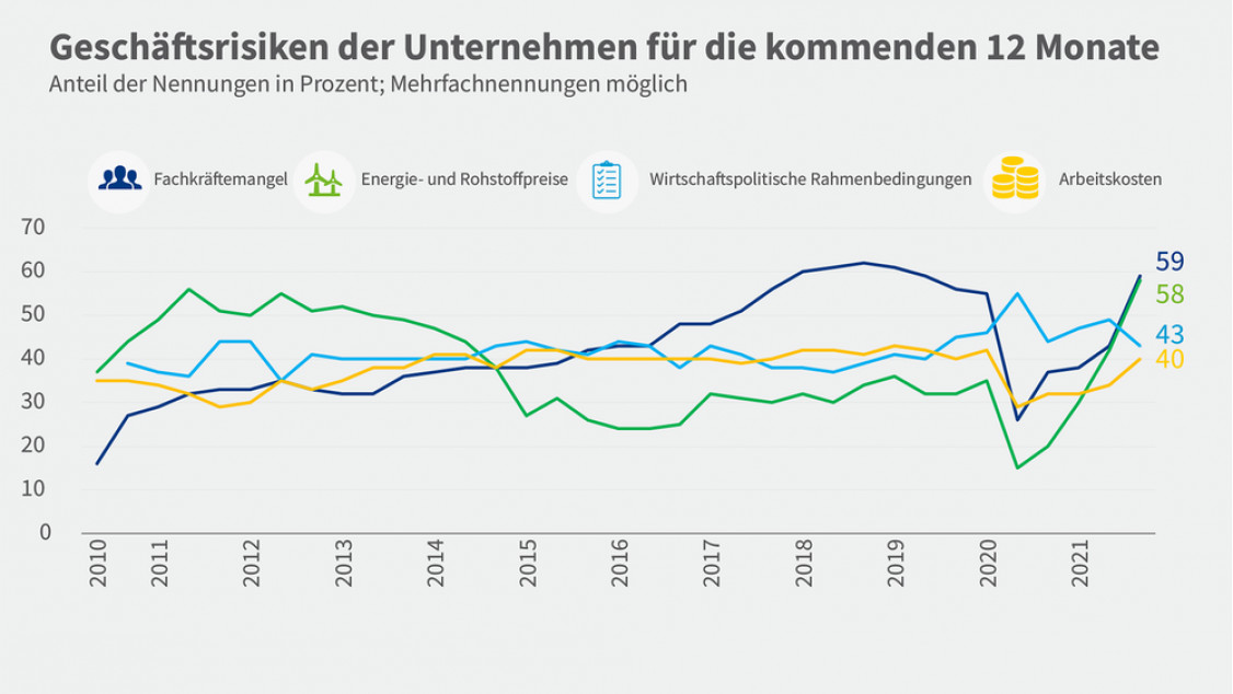 Damit sei klar: „Vor Ende nächsten Jahres werden wir das Vorkrisenniveau kaum erreichen. Es wird eine große Herausforderung, auf einen tragenden Wachstumspfad einzumünden.“ Der sei aber notwendig, um die Klimapolitik in Deutschland umzusetzen oder auch die demografische Belastung zu stemmen. Bei den Erwartungen der Unternehmen schlagen in der Umfrage quer durch alle Branchen und Regionen viele Geschäftsrisiken durch, die sich nicht schnell lösen lassen. Als besondere Hürden beschreiben die Betriebe die hohen Energie- und Rohstoffpreise sowie strukturelle Herausforderungen wie den Fachkräftemangel oder den Klimaschutz. „Die Politik muss jetzt alles daran setzen, aus Deutschland wieder einen attraktiven Investitionsstandort zu machen“, mahnt Wansleben.