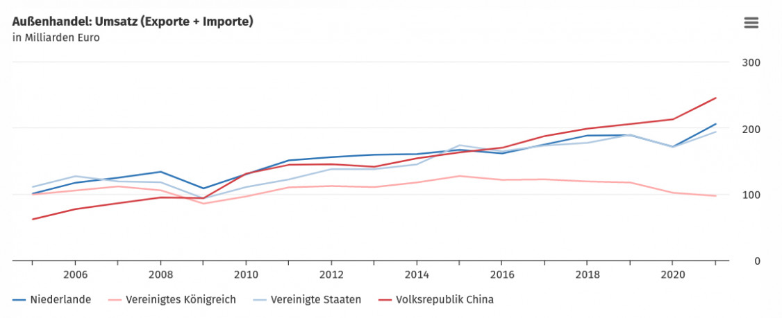 Auf den Rängen 2 und 3 der wichtigsten Handelspartner folgten die Niederlande mit einem Umsatz von 206,1 Milliarden Euro (+20,1 %) und die Vereinigten Staaten mit 194,1 Milliarden Euro (+13,4 %). Damit erholten sich die Außenhandelsumsätze mit den Niederlanden und den Vereinigten Staaten nach den Einbrüchen im ersten Corona-Krisenjahr 2020 (-9,4 % bzw. -9,9 % gegenüber 2019). Im Außenhandel mit China war der Umsatz dagegen 2020 trotz Krise um 3,5 % gestiegen.
