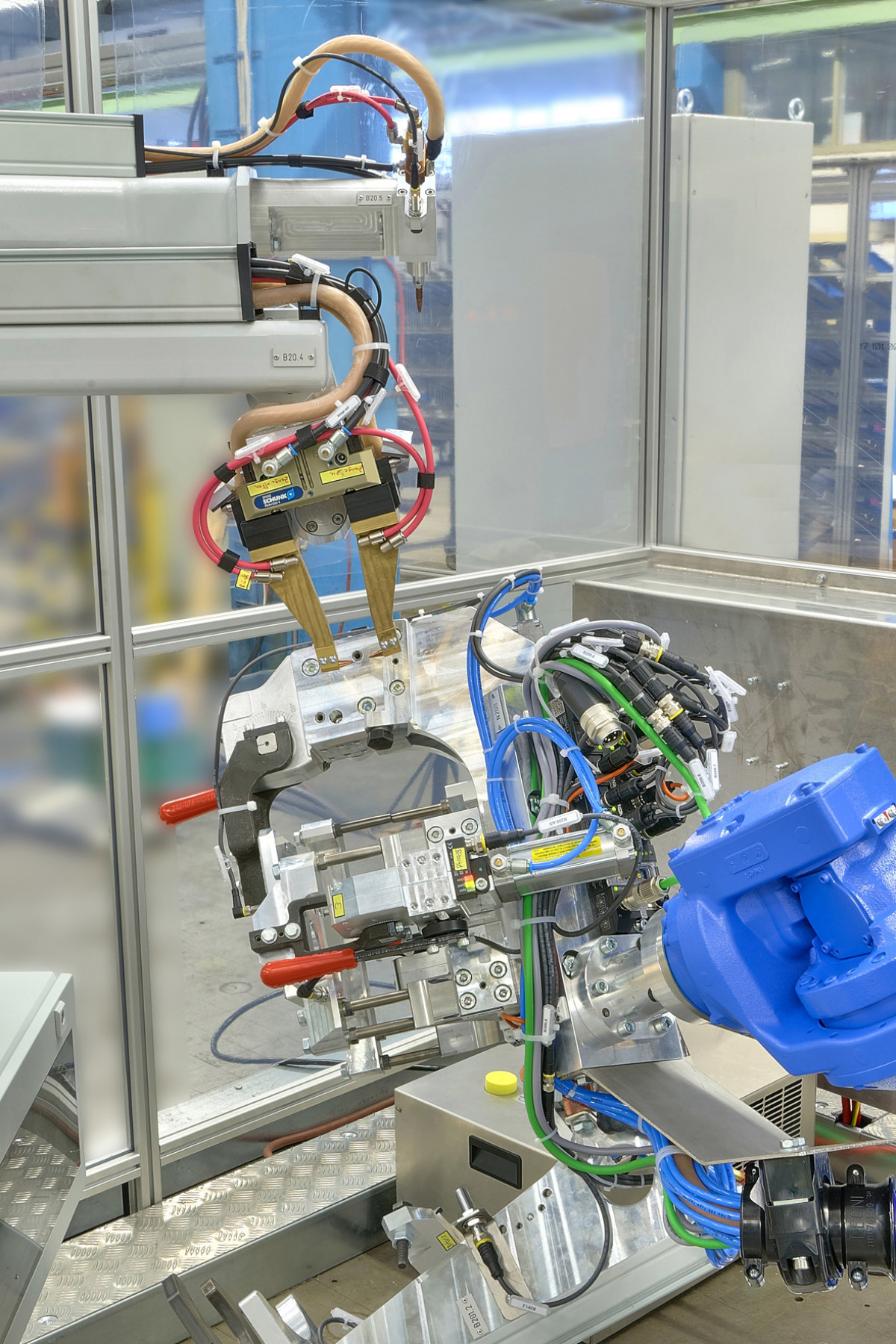 Aufgrund der Komponenten des Abgasstranges mit unterschiedlichen Geometrien sind auch angepasste Lösungen bei der Anlagenauslegung gefragt. Dazu Dr. Grebe: „Sind die Bauteile kompakt, ist in der Regel eine Lösung sinnvoll, bei der der Roboter die Werkstücke zu stationären Schweißstationen führt. Beim Verbinden von sehr komplexen und großen Bauteilen lässt man jedoch besser einen Roboter mit Mikroschweißzange oder Stoßpunkter die einzelnen Schweißpositionen abfahren.“ Um die Werkzeuge je nach Aufgabe vollautomatisch anzupassen, verwendet DALEX ein Schnellwechselsystem am Roboterflansch.