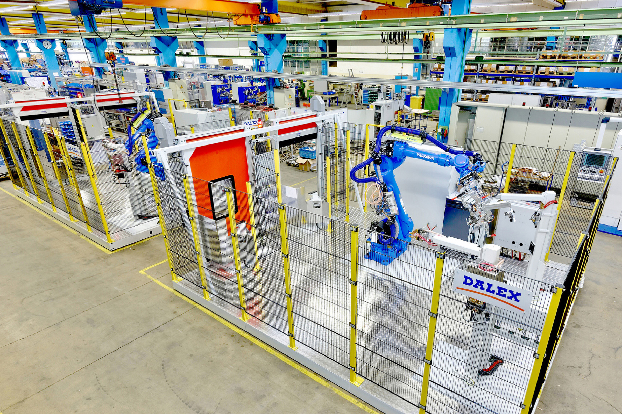 Die Werkstücke selbst werden meistens aufgrund ihrer Form manuell in ein oder zwei Einlegepositionen zugeführt. Dabei laufen die Arbeiten parallel: Der Bediener be- und entlädt die Anlage auf der einen Seite, während der Roboter auf der anderen Seite die Teile verschweißt. Allerdings verfügt DALEX zusätzlich über vollautomatische Linienlösungen, bei denen auch das Einlegen der Bauteile und die Entnahme der Fertigteile mittels Roboter erfolgen.