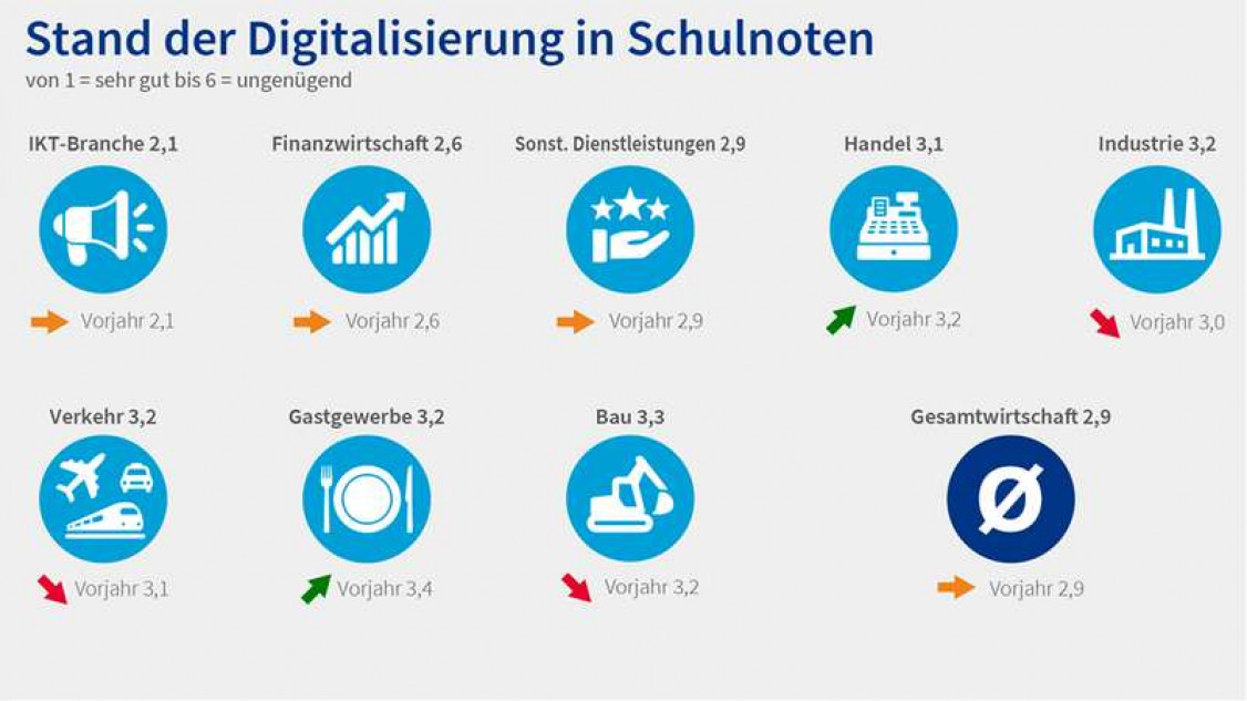 „Viele Unternehmen haben ihre Digitalisierungsbemühungen im vergangenen Pandemie-Jahr intensiviert. Sie haben Prozesse, Dienstleistungen und Produkte umgestellt“, sagt Ilja Nothnagel, Mitglied der DIHK-Hauptgeschäftsführung. „Das ist ein sehr erfreuliches Zeichen.“ Als wichtigste Motive nennen die Unternehmen die Flexibilisierung des Arbeitens (51 Prozent) und die Erhöhung der Kundenbindung (40 Prozent). Trotzdem schätzen sie den eigenen Stand der Digitalisierung – unverändert zum Vorjahr – nur als befriedigend ein (Durchschnittsnote: 2,9). Die Informations- und Kommunikationsbranche bewertet sich mit einer Note von 2,1 im Vergleich zu anderen Branchen am besten, gefolgt von der Finanzwirtschaft (Note 2,6) und den sonstigen Dienstleistern (Note 2,9).