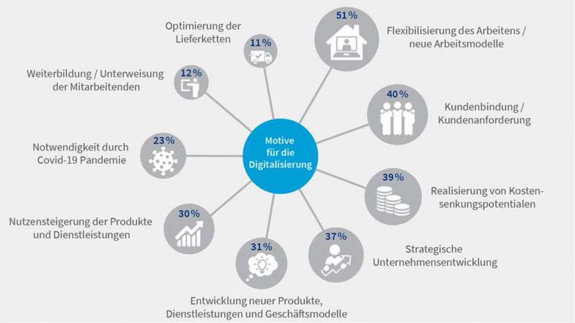 Während der Corona-Pandemie haben viele Unternehmen ihre Arbeitsabläufe digitalisiert. Flexibleres Arbeiten zählt für die befragten Betriebe branchenübergreifend zu den Hauptmotiven für die digitale Transformation. Auch sich verändernde Kundenbedürfnisse wirken als Treiber der Digitalisierung – vor allem in Branchen, in denen sich digitale Plattformen in den vergangenen Jahren stark verbreitet haben. Dazu zählen beispielsweise die Finanzwirtschaft, der Handel und das Gastgewerbe. Die Betriebe nutzen die Möglichkeiten der Digitalisierung auch immer häufiger zur Realisierung von Kosteneinsparungen , der Entwicklung neuer digitaler Geschäftsmodelle und der Entwicklung von Produkten und Dienstleistungen.