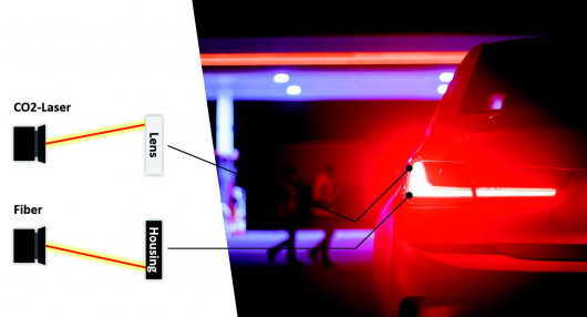 das Freiwerden innerer Spannungen. - Neue Anwendungsmöglichkeiten: In einer gemeinsamen Entwicklung (von bielomatik, LZH und Coherent) wurde ein CO2-Laser so angesteuert, dass auch IR-transparente Bauteile prozesssicher, flexibel und schonend geschweißt werden können. Ein Beispiel dafür ist eine Rückleuchte mit einem Gehäuse aus ABS/PC und Scheibenglas aus PMMA.