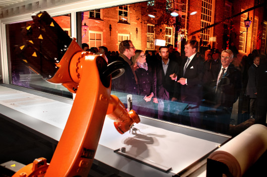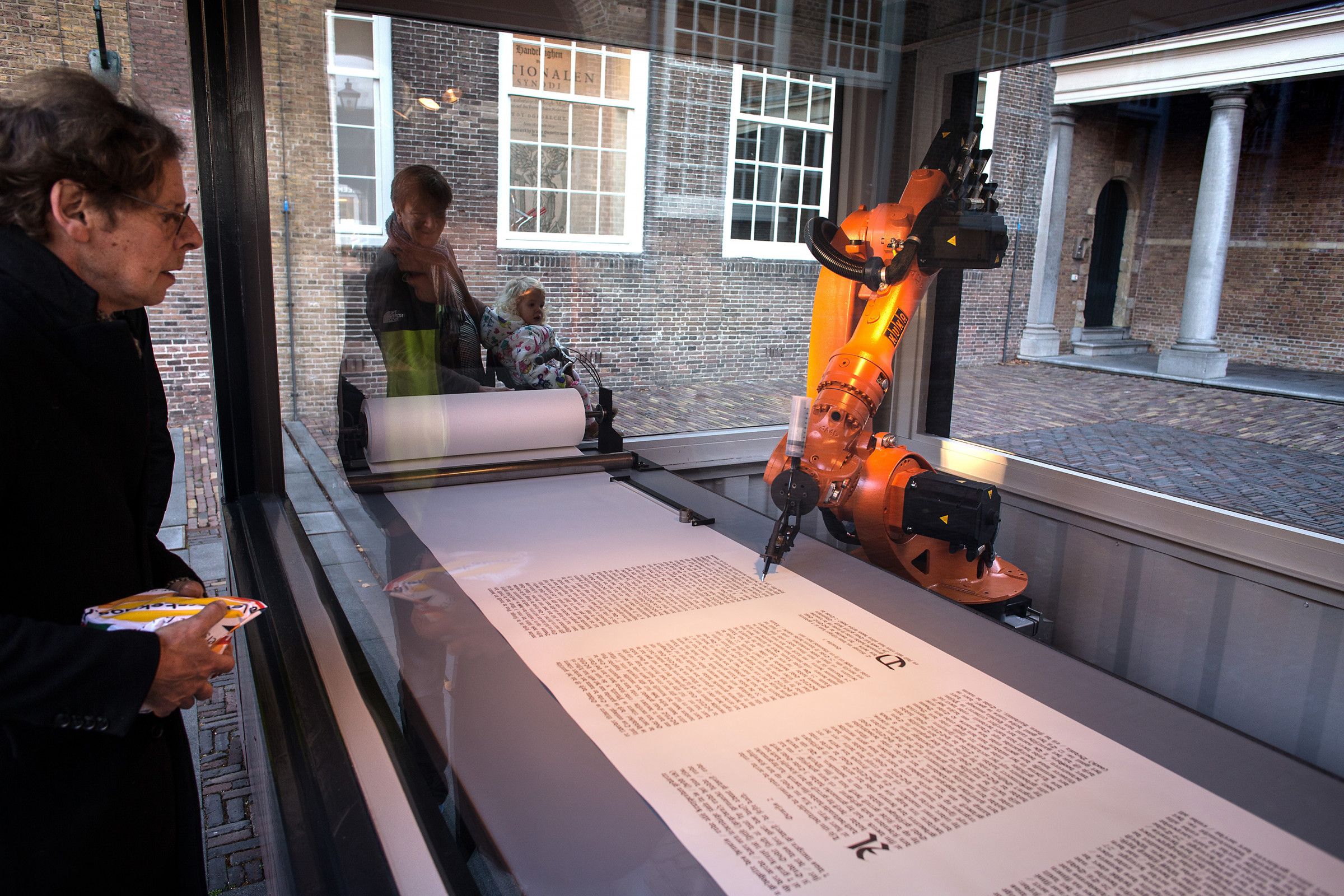 Die Software des Roboters enthält den Bibeltext in Form eines speziellen digitalen Codes. Außerdem beinhaltet sie auch den Kalligrafie-Font, der auf Grundlage von historischen Vorlagen speziell für dieses Projekt entwickelt wurde. Der bibelschreibende Roboter steht im Kontext des 400-jährigen Jubiläums der Dordrechter Synode. Dordrecht war in den Jahren 1618/19 Versammlungsort der Reformation in den Niederlanden. Damals wurde der Beschluss gefasst, eine neue Bibelübersetzung aus dem Griechischen ins Niederländische vorzunehmen. So entstand die bis heute maßgebliche Staatenbibel. Diese wurde maschinell gedruckt und vervielfältigt. Zuvor wurden Schreibarbeiten meist noch von Mönchen ausgeführt. Diese monotone und detailreiche Arbeit, die nun der Roboter übernimmt, verbindet die Kultur der Handschrift mit der maschinellen Reproduktion.