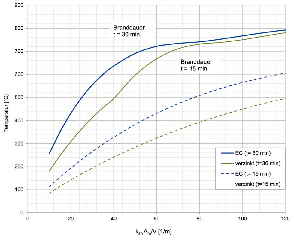 Die nachfolgende Abbildung zeigt den Unterschied in Anlehnung an die Euro-Nomogramme in Abhängigkeit des Faktors ksn*Am/V (Abschattungsfaktor*Profilfaktor) im Falle eines Normbrands nach der Einheits-Temperaturzeitkurve.