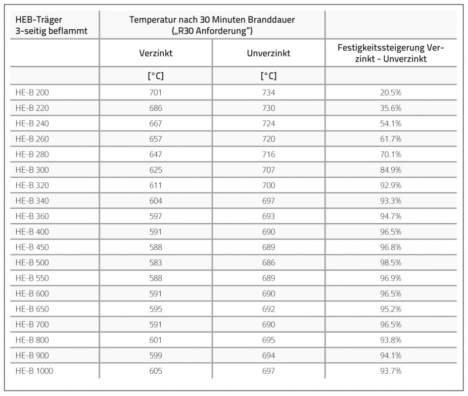 Ein direkter Vergleich am Beispiel von dreiseitig beflammten HEB-Trägern in feuerverzinkter und nicht-feuerverzinkter Ausführung zeigt auf sehr anschauliche Weise den positiven Effekt der Feuerverzinkung auf den Feuerwiderstand nach einer Branddauer von 30 Minuten (Abb. 3). Es werden durch Feuerverzinken Festigkeitssteigerungen von bis zu 98,5 Prozent erreicht. Die Erwärmung der feuerverzinkten Träger liegt bis zu 103 °C unter der Temperatur von nicht-verzinkten Trägern.