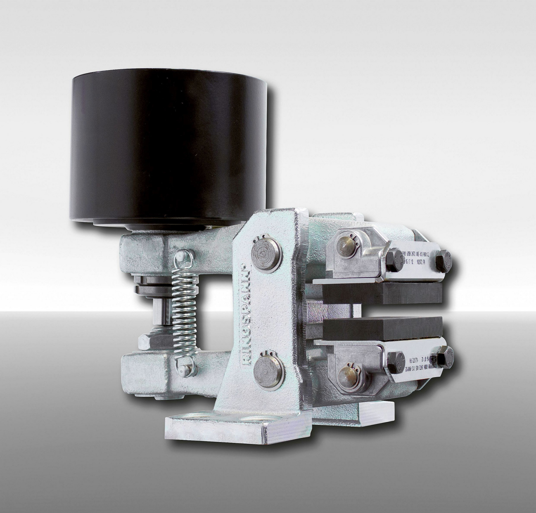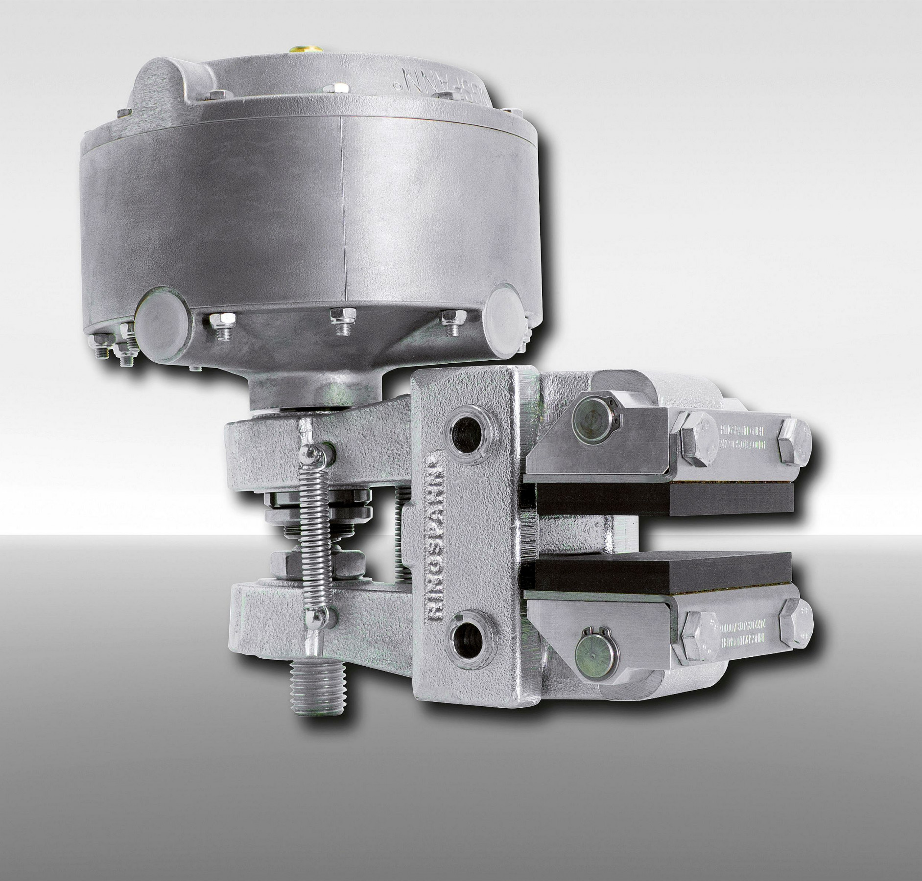 Hochgradig standardisiert ist die RINGSPANN-Bremse vom Typ DH 020 PFK. Sie wird pneumatisch betätigt und federgelüftet, eignet sich für 12,5 mm dicke Bremsscheiben und wird rechtwinklig zur Bremsscheibe montiert. © RINGSPANN
