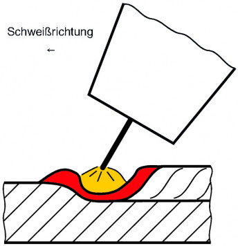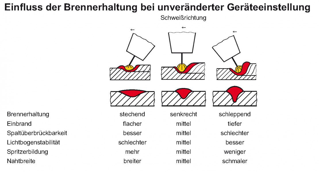 Grundsätzlich gilt: Je „stechender“ geschweißt wird, desto flacher ist die Naht und desto geringer ist der Einbrand.