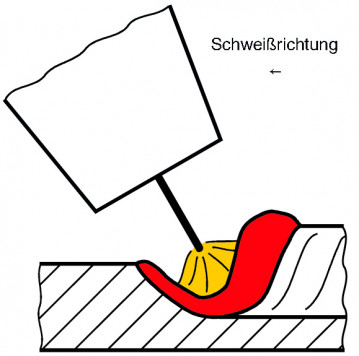 Meistens wird mit einer nahezu senkrechten oder leicht stechenden Brennerhaltung geschweißt. Dann sind Einbrand und Nahtbreite ausgewogen.