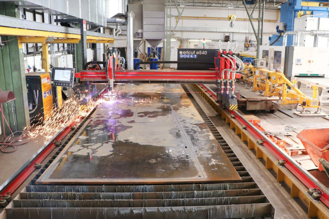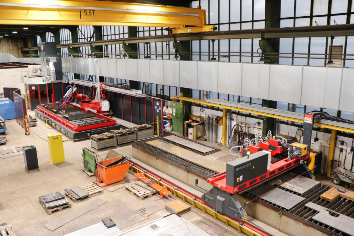 Die neue Führungsmaschine, eine erlcut e540 mit 4 m Spurbreite, ist wie ihre Vorgängerin für Blechformate bis 2,5 x 13 m ausgelegt. Das Portal ist mit drei Autogenschneidbrennern mit Innenzündung und Innenhöhenregelung und einem Plasmabrenner ausgestattet. Die Bestands-Stromquelle HiFocus 280i konnte, nachdem sie beim Hersteller überholt wurde, weiterverwendet werden. Mit dem Plasmaprozess sind Schnittlängen bis 30 mm und mit dem Autogenprozess Schnittlängen bis 200 Millimeter realisierbar.