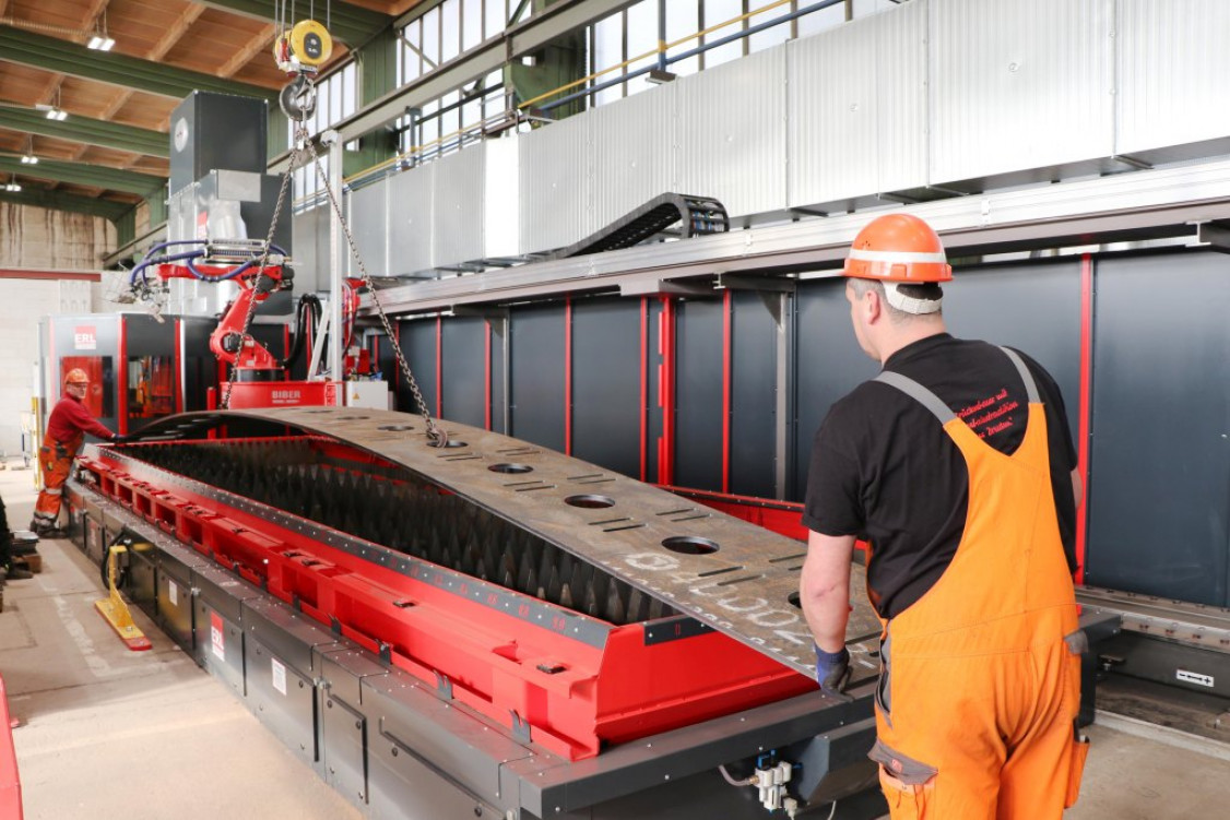 ERL hat ein Konzept ausgearbeitet, das überzeugt hat: In die vorhandene Peripherie, bestehend aus Schneidtisch und Absauganlage, wird eine neue Führungsmaschine mit den neuesten technischen Features zum Senkrechtschneiden mit Plasma- und Autogentechnik integriert. Für die Schweißnahtvorbereitung kommt das Roboterschneidsystem BIBER zum Einsatz, das vielfältige Anwendungsmöglichkeiten bietet und auch sehr flache Winkel realisieren kann. „Nachdem wir die Bauteile gesehen haben, war relativ schnell klar, dass das mit einem Fasenaggregat nicht abbildbar ist“, so Sebastian Biermeier, Prokurist und Verkaufsleiter bei der ERL Automation GmbH. „Es müssen oft Materialdickensprünge gemacht werden, welche teils sehr flache Fasen erfordern. Ein Fasenaggregat kommt hier sehr schnell an seine Grenzen“, erklärt er weiter.