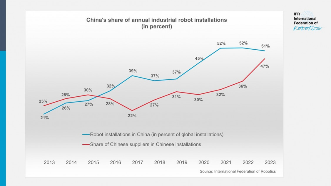 Den Roboterherstellern aus China ist es gelungen den Anteil der von lokalen Anbietern installierten Industrie-Robotern von 30 Prozent im Jahr 2020 auf 47 Prozent im Jahr 2023 zu erhöhen. Diese Robotik-Unternehmen profitieren dabei von einem rasant wachsenden chinesischen Endkundenmarkt mit steigender Nachfrage nach verschiedensten Konsumgütern. Zahlreiche Branchen bauen ihre Automatisierungsprojekte aus: Fast zwei Drittel aller Industrie-Roboter in der globalen Elektronikindustrie wurden beispielsweise allein in China installiert (2023). Chinesische Hersteller lieferten 54 Prozent aller Einheiten für diesen riesigen Binnenmarkt und damit rund 33 Prozent der weltweiten Nachfrage in der Elektronikindustrie. In der heimischen Metallindustrie und im Maschinenbau erreichen chinesische Roboterlieferanten sogar einen Marktanteil von 85 Prozent .