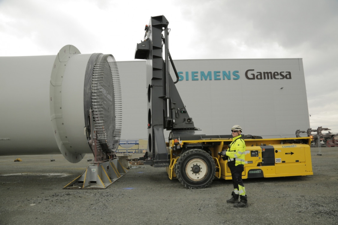 The Combi-LC, designed at Combilift’s HQ and Manufacturing plant in Ireland, in collaboration with Siemens Gamesa, allows for the movement of wind turbine blades and towers – some as long as 115m and weighing in at around 70t, through production stages and on to storage locations – which can sometimes be as far as 5km apart.
