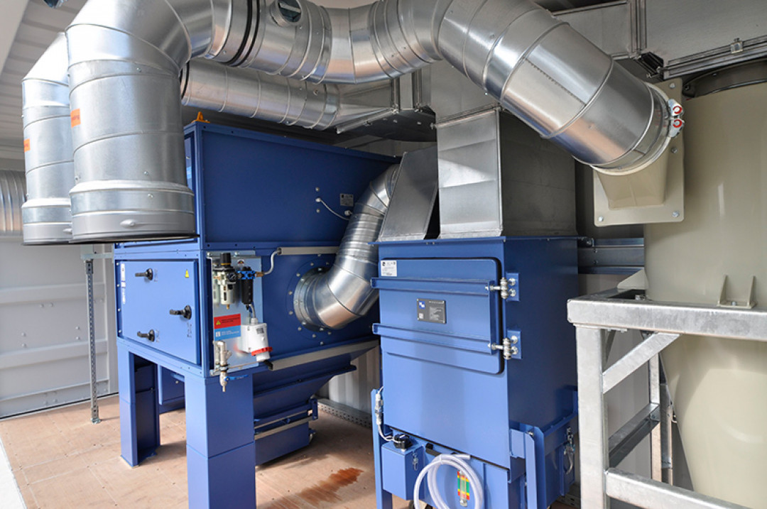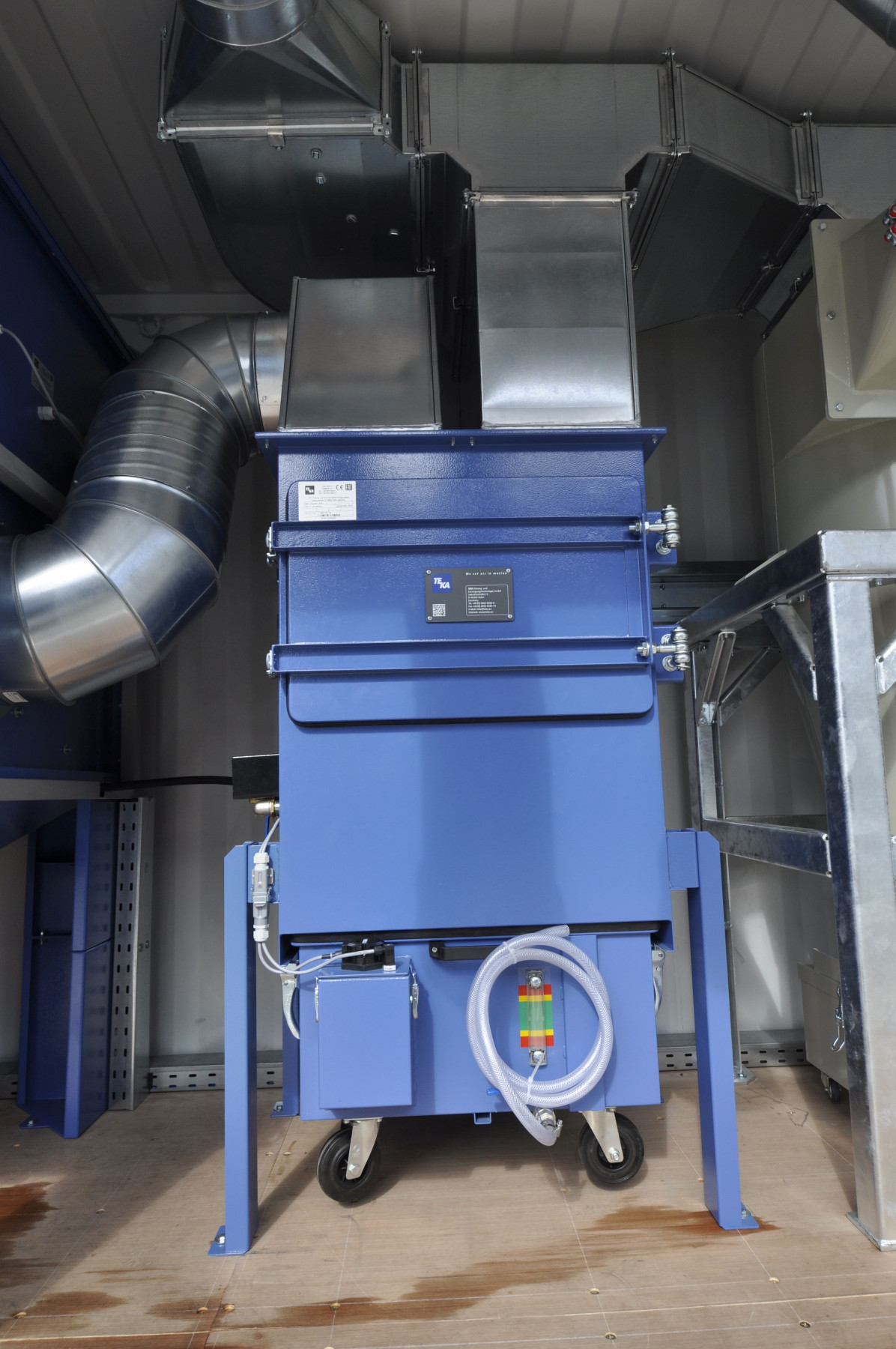 Die W3-zertifizierte ZPF ist bestückt mit neun automatisch abreinigbaren, langlebigen Filterpatronen (Filterfläche von 112,5 m²) vom Typ Easy Clean plus nano. Bei einer Ventilatorleistung von 7.500 m³/h eignet sich die Anlage vor allem, um große Mengen schadstoffhaltiger Luft zu erfassen und zu reinigen. Ihr vorgeschaltet ist ein Funkenvorabscheider, der schwere und glühende Teilchen abfängt. Als zusätzliche Sicherheitsmaßnahme werden die Schleifstäube zunächst über einen Zyklon als weiteren Vorabscheider gelenkt, um grobe Partikel von vornherein abzufangen.