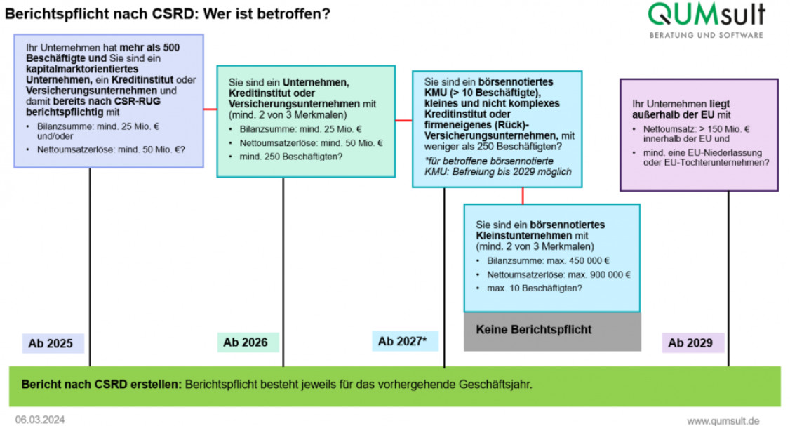- Ab 2027: Börsennotierte KMU (> 10 und < 250 Beschäftigte), kleine und nicht komplexe Kreditinstitute sowie firmeneigene (Rück)-Versicherungsunternehmen, mit weniger als 250 Beschäftigten (Ausnahme: Börsennotierte Kleinstunternehmen*).