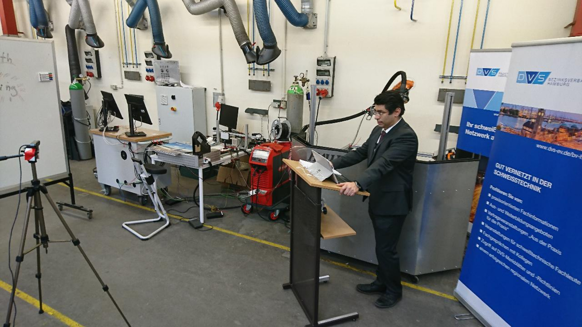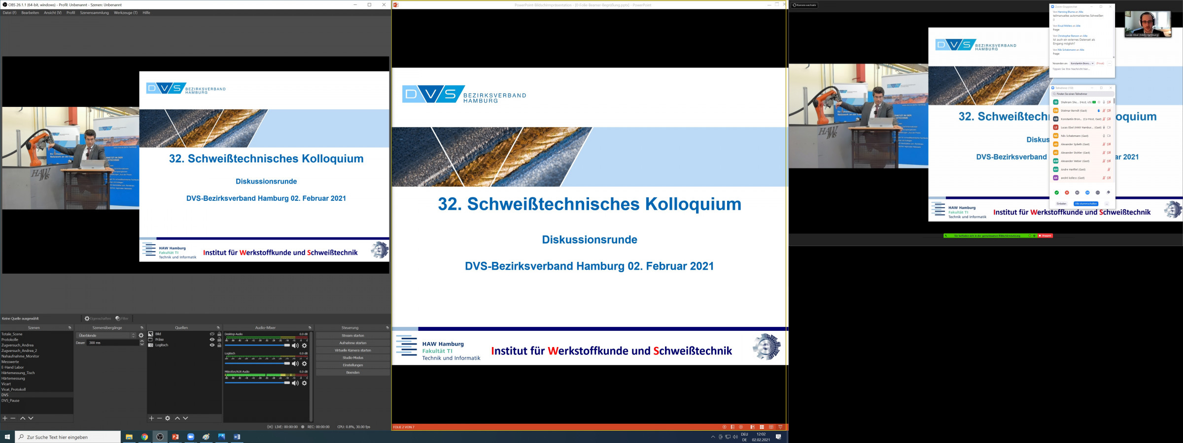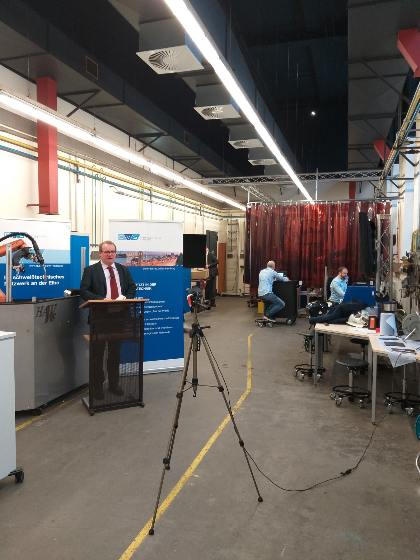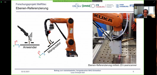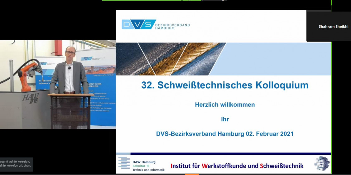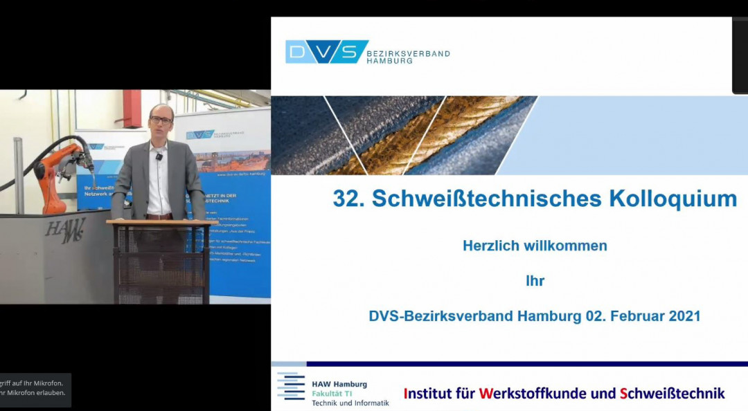 Der stellvertretende Vorsitzende des DVS-Bezirksverbandes Hamburg, Dipl.-Ing. Sven Noack, Geschäftsführer der SLV Nord, begrüßte beachtliche 168 Teilnehmende – dieses Mal nicht aus der prall gefüllten Aula der Hochschule sondern per Internet-Kamera aus den schweißtechnischen Werkstätten und Laboren des HAW-angehörigen Instituts für Werkstoffkunde und Schweißtechnik (IWS): „Heute ist alles anders, wir vermissen Sie hier und heute an der HAW Hamburg. Aber es fühlt sich aufgrund der aktuell bekannten Herausforderungen richtig an. Wir freuen uns über den großen Zuspruch und sind positiv überrascht über die grandiose Anmeldezahl!“