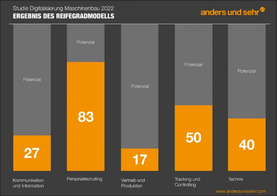 In jeder Kategorie wurden bis zu 100 Punkte vergeben, der Durchschnittswert aller untersuchten Digitalplattformen bestimmte den so genannten Reifegrad. Dessen Ausprägung war in den Karrierebereichen der Unternehmensportale mit durchschnittlich 83 Punkten am höchsten. In allen anderen Bereichen dagegen sieht die Studie noch reichlich Optimierungspotenzial. Dies gilt insbesondere für die Informations- und Kommunikationsstrategien der Websites (27/100) sowie für deren Nutzung in den Bereichen Vertrieb und Produktion (17/00). Die Kategorien Tracking und Controlling (durchschnittlich 50 von 100 Punkten) sowie technische Umsetzung (40/100) schnitten mittelmäßig ab.