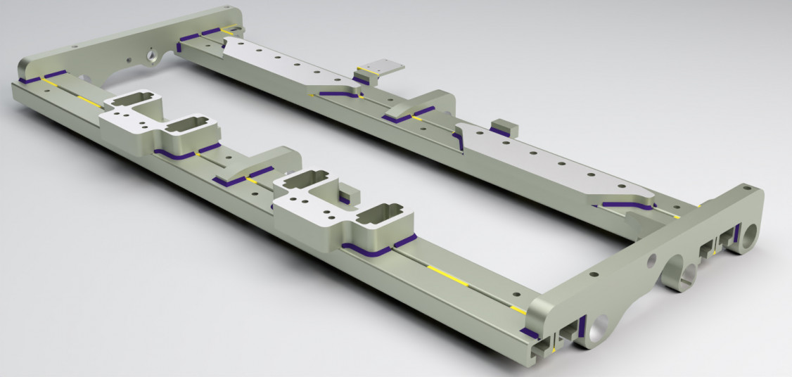 So setzt ein Hersteller von Gabelstapleranbaugeräten neueste Technologien und Software für die Herstellung dynamisch beanspruchter Schweißbaugruppen, wie im Bild oben zu sehen, ein. Damit können die negativen Wirkungen der Fertigung auf die Bauteileigenschaften – Werkstoffzustand, Formgenauigkeit und Abmessungstoleranzen, Festigkeit und Steifigkeit – in den verschiedenen Phasen der Herstellung begrenzt werden. Unter strikter Einhaltung einer festgelegten Schweißfolge werden die geforderten Toleranzen ohne Nachrichten eingehalten und die Eigenspannungen in den Bauteilen geringgehalten.