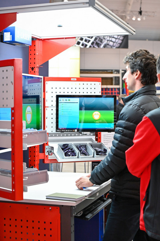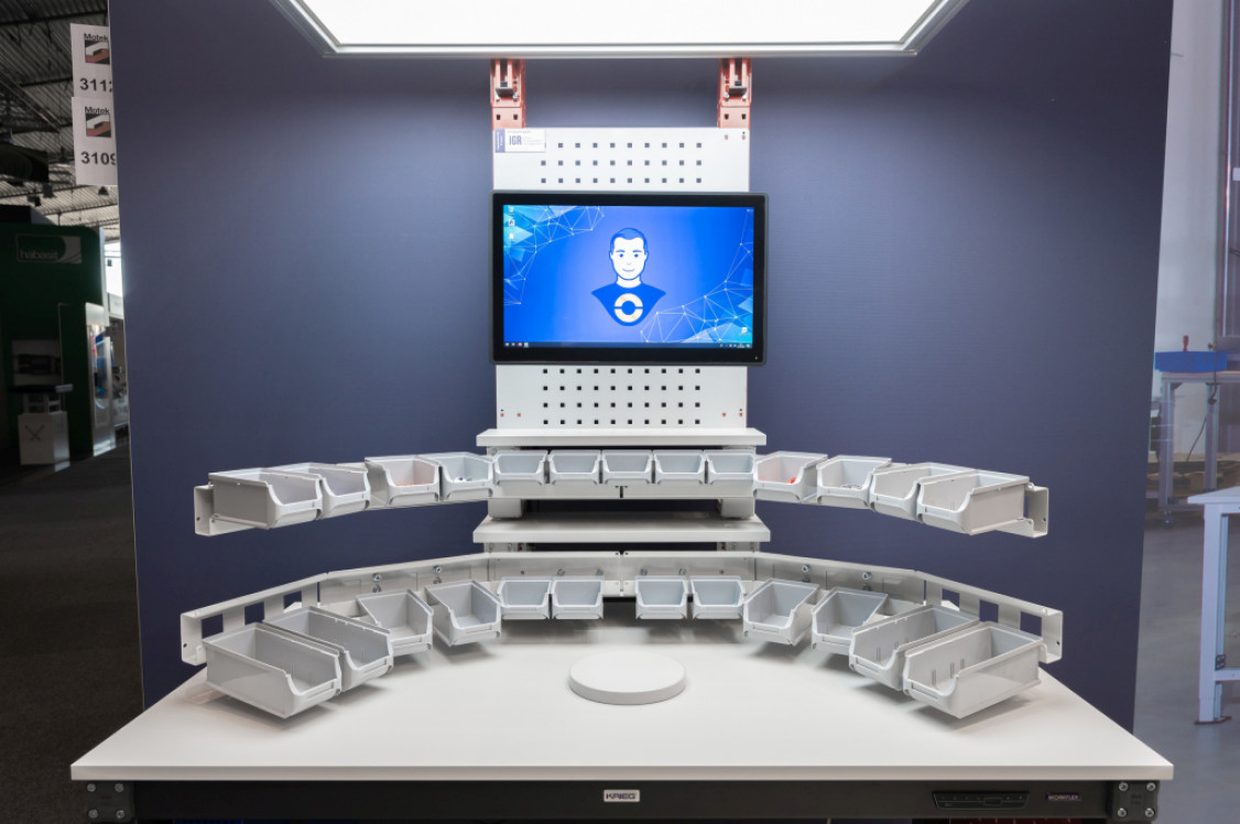 „Der Schlaue Klaus“ kann optimal mit den ergonomischen Arbeitsplatzsystemen aus dem Hause Krieg verbunden werden. Insbesondere der Montagearbeitsplatz ERGOSMART bietet sich für das effiziente Arbeiten mit digitalen Arbeitsanweisungen an. ERGOSMART ermöglicht eine maximale Effizienzsteigerung durch optimale Best-Point-Greifräume. Die Materialbereitstellung erfolgt durch Behälter auf Boxenträgerschienen, die ohne Störung des Arbeitsraumes für eine bessere Erreichbarkeit der Materialien sorgen. Auf Wunsch kann das kognitives und kamerabasiertes Assistenzsystem mit einem Pick-by-Light System kombiniert werden. Hat der Mitarbeiter in das richtige Fach gegriffen, die korrekte Anzahl an Schrauben entnommen und passend montiert? Gerade an Arbeitsplätzen, an denen sich viele Teile in den Schütten, Boxen und Sichtlagerkästen ähneln, hilft die LED-Anzeige.