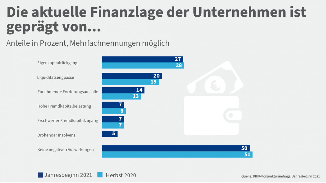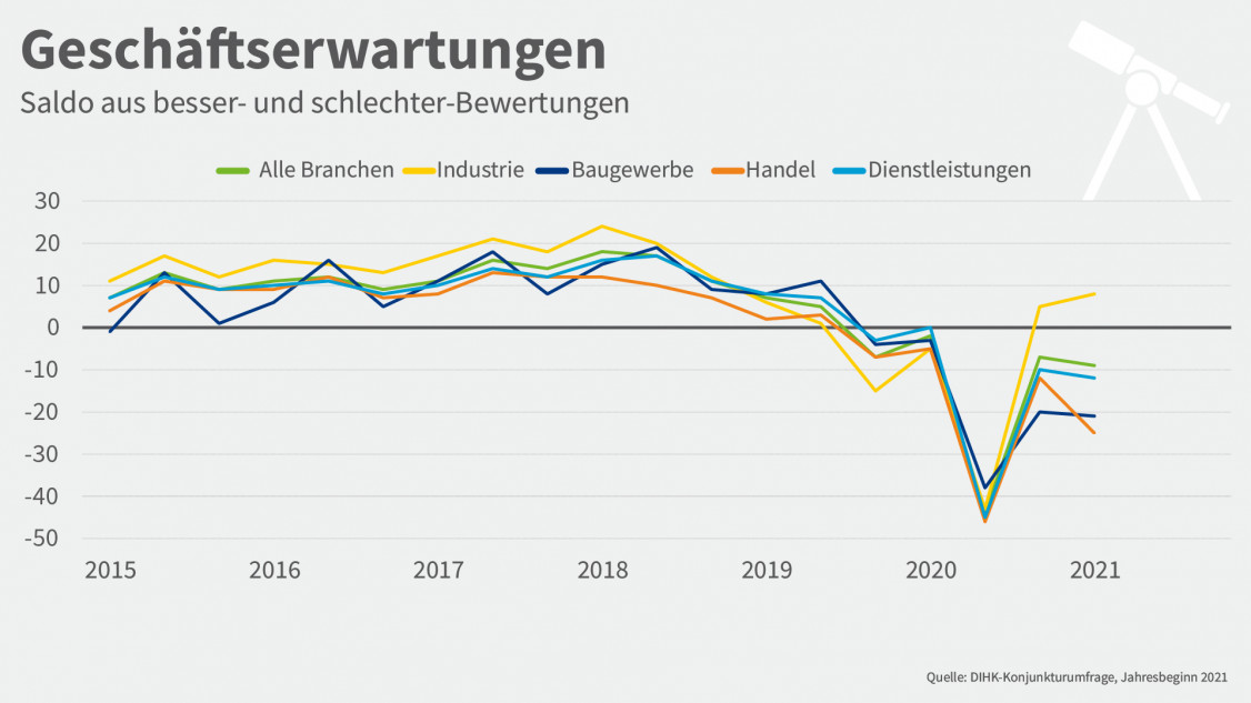 Erschwerend kommt hinzu, dass auch staatliche Investitionsprogramme häufig an fehlenden Genehmigungen und am Fachkräftemangel scheitern. Selbst in der Krise kann der Staat vorhandene Ausgabenprogramme somit oft nicht zügig umsetzen. Bemerkbar macht sich das insbesondere im Tiefbau. Hier erwarten 38 Prozent der Unternehmen schlechtere Geschäfte, nur 6 Prozent bessere. Der wirtschaftliche Aufschwung steht somit in vielerlei Hinsicht auf wackeligen Füßen. Die Unternehmen werden weiterhin ihre Flexibilität und Anpassungsfähigkeit unter Beweis stellen müssen, um wirtschaftlich durch die Corona-Pandemie zu kommen.