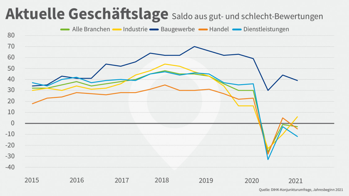 Ein Jahr nach Beginn der Corona-Pandemie sind Geschäftslage und -erwartungen noch weit vom Vorkrisenniveau entfernt. Das ergibt die aktuelle Konjunkturumfrage des Deutschen Industrie- und Handelskammertages (DIHK) unter bundesweit mehr als 30.000 deutschen Unternehmen.