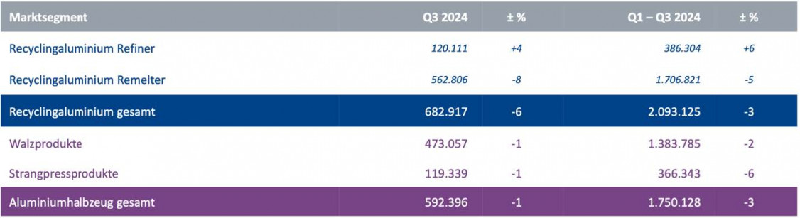 Die weiterverarbeitenden Produzenten von Aluminiumhalbzeug erreichten im dritten Quartal mit über 592.000 Tonnen knapp das Vorjahresniveau (-1 Prozent). In den ersten drei Quartalen produzierten sie rund 1,8 Mio. Tonnen Halbzeuge (-3 Prozent). Darunter verzeichneten die Hersteller von Walzprodukten mit 1,4 Mio. Tonnen einen vergleichsweise moderaten Rückgang (-2 Prozent). Stärker sank die Fertigung von Aluminium-Strangpressprodukten (-6 Prozent auf 366.000 Tonnen).