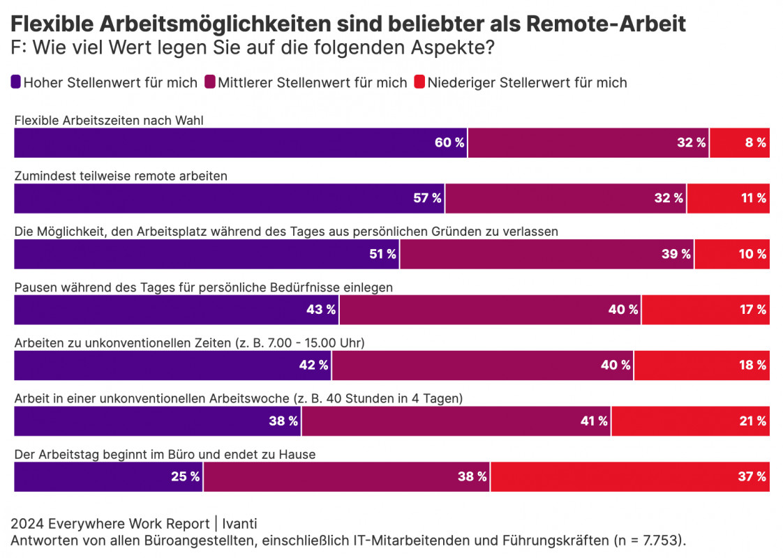 Das Bedürfnis, die Arbeitszeiten selbstständig zeitlich flexibel einzuteilen, hat bereits höhere Priorität als die räumliche Ungebundenheit durch Homeoffice und Hybrid Work. Das spiegelt nicht nur den Wunsch nach Flexibilität wider, sondern deutet auch auf eine fundamentale Veränderung in der Arbeitskultur hin. Dieser müssen Unternehmen durch passende Infrastrukturen und Regelungen gerecht werden.
