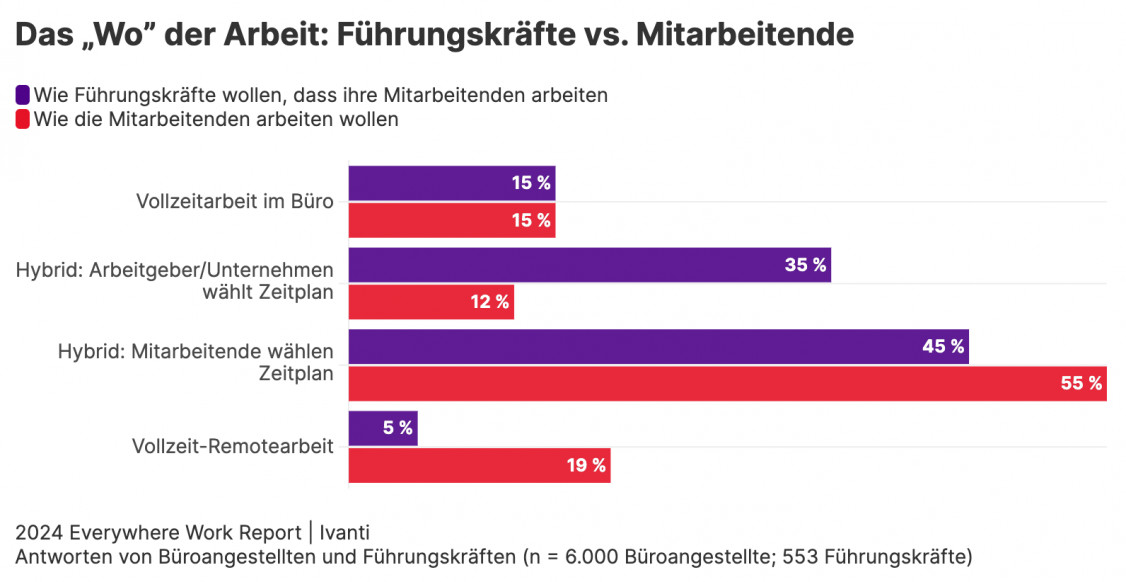 Letztes Jahr haben drei Viertel der deutschen Arbeitgeber ihre Mitarbeitende für mindestens drei Wochentage wieder zurück ins Büro beordert, mehr als im internationalen Vergleich. Jedoch haben 16 Prozent dieser Arbeitgeber anschließend Umsatzeinbußen verzeichnet. 13 Prozent hatten Einbußen bei Verkäufen und 29 Prozent Rückgänge der Mitarbeiterproduktivität. Trotzdem erwarten 17 Prozent der deutschen Arbeitgeber, dass ihr Personal Vollzeit im Büro ist. Dagegen glauben 85 Prozent der Mitarbeitenden, dass es keine Rolle spielt, wo man arbeitet, solange die Qualität stimmt.