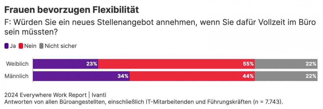 Die Diskussion über die Vier-Tage-Woche wird kontrovers geführt. Die Studie von Ivanti zeigt: Insgesamt ist in Deutschland eine nicht traditionelle Arbeitswoche so begehrt wie in den USA mit jeweils 43 Prozent der Befragten. Weltweit wollen insbesondere Frauen (42 % vs. Männer 33 %) diese Möglichkeit, beispielsweise, um an vier Wochentagen einen Vollzeitjob zu stemmen.