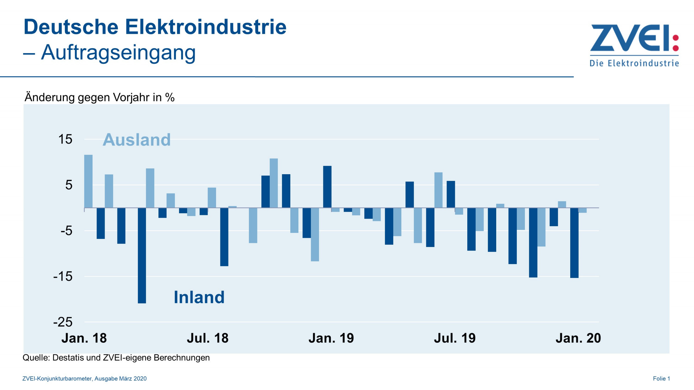 Der Umsatz der deutschen Elektrobranche belief sich im Januar dieses Jahres auf 14,8 Milliarden Euro – ein Rückgang um 3,4 Prozent gegenüber Vorjahr. Der Inlandsumsatz gab um 4,8 Prozent auf 7,0 Milliarden Euro nach, der Auslandsumsatz sank um 2,1 Prozent auf 7,8 Milliarden Euro. Die Erlöse aus Geschäften mit Kunden aus dem Euroraum beliefen sich im Januar auf 2,9 Milliarden Euro (- 2,3%). Der Umsatz mit Partnern aus Drittländern lag mit 4,9 Milliarden Euro um 1,9 Prozent unter Vorjahr.
