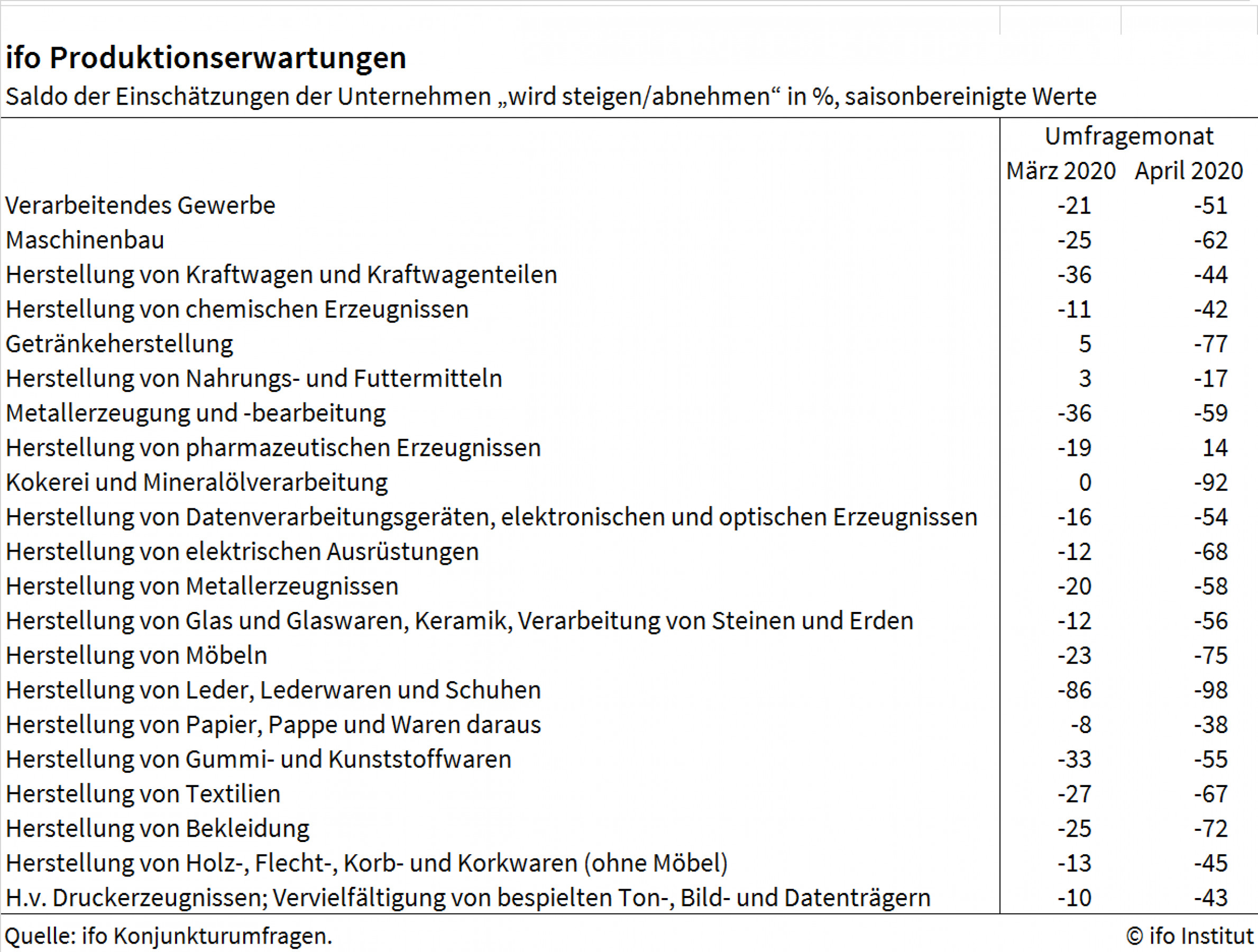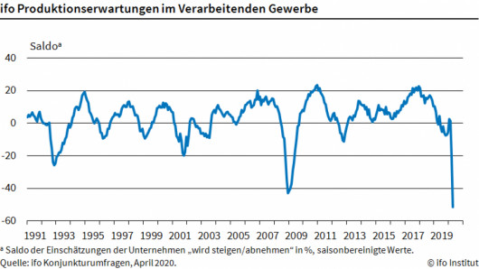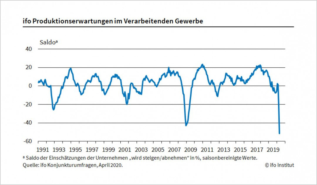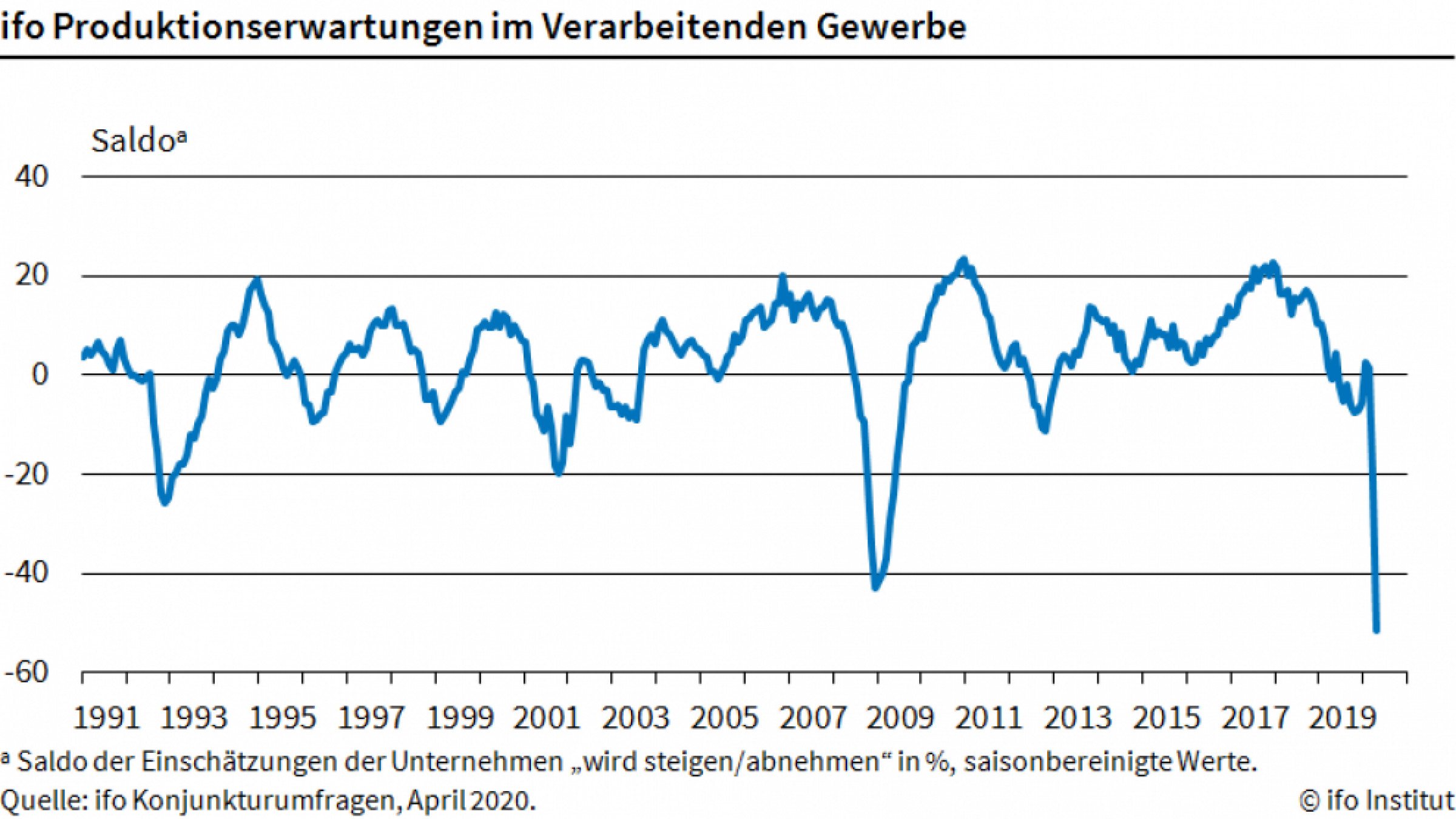 Die deutsche Industrie erwartet einen noch nie dagewesenen Einbruch ihrer Produktion. Der entsprechende ifo-Index für die kommenden drei Monate stürzte im April auf minus 51,4 Punkte, von minus 21,4 im März. Das ist der tiefste Punkt seit der Wiedervereinigung.