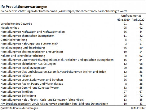 In der Getränkeherstellung fiel der Produktionsindex auf minus 77 Punkte im April, nach plus fünf im März. Noch schlechter sind die Erwartungen in der Herstellung von Leder, Lederwaren und Schuhen. Der Index fiel im April weiter auf minus 98 Punkte, nach minus 86 im März. Auch die Hersteller von Möbeln, Bekleidung, Glaswaren oder elektrischen Ausrüstungen blicken überaus pessimistisch in die Zukunft.