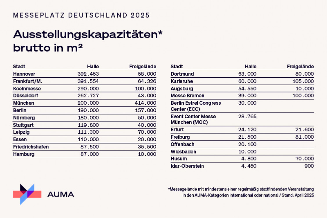 Aktuell stehen in Deutschland rund 3,25 Millionen Quadratmeter Hallenfläche auf den Messegeländen zur Verfügung, wie die AUMA-Umfrage weiter ergibt. Auf die 24 Messeplätze mit nationaler oder internationaler Bedeutung entfallen davon 2,78 Millionen Quadratmeter Hallenfläche. Messe- und Ausstellungsplätze mit regionaler Bedeutung verfügen über eine Bruttohallenfläche von knapp 468.000 Quadratmetern. Diese Kapazitäten sollen in den kommenden Jahren stabil bleiben. Insgesamt gibt es rund 70 Messeplätze in Deutschland, auf denen jährlich rund 350 Fach- und Publikumsmessen stattfinden.
