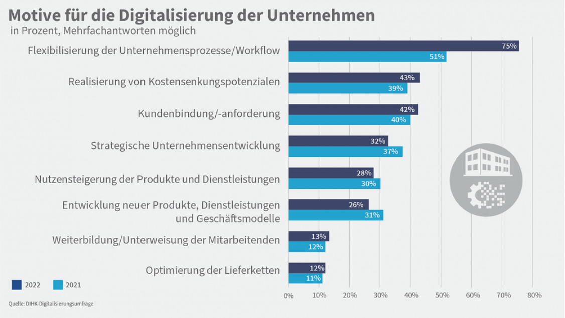 Die Unternehmen in Deutschland bleiben bei ihrer durchwachsenen Selbsteinschätzung in punkto Digitalisierung. Dies geht aus einer aktuellen DIHK-Umfrage unter bundesweit mehr als 4.000 Betrieben hervor, die Ende 2022 zu ihren Motiven und zu den Herausforderungen bei der Umsetzung der Digitalisierung befragt wurden.