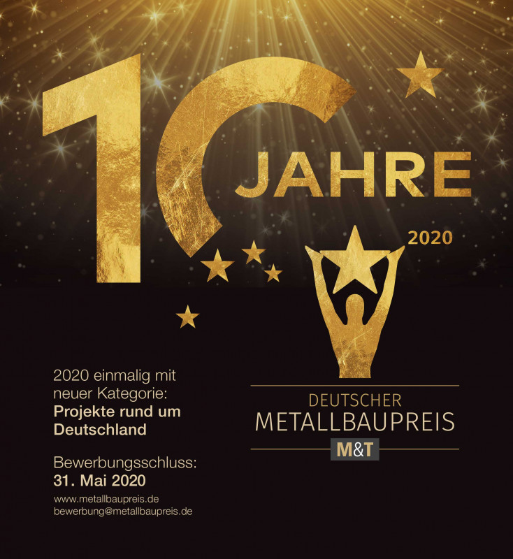 Erstmalig und nur 2020 wird der Preis auch in der Kategorie „Projekte rund um Deutschland“ verleihen. Hier können sich deutsche Betriebe mit Projekten bewerben, die sie in den Grenzländern rund um Deutschland gebaut haben. Die Übergabe des Objekts durch den Metallbauer liegt in dieser Sonderkategorie zwischen dem 1. Januar 2015 und dem 31. Mai 2020. Für die anderen sechs Kategorien gilt: Die Arbeiten des Metallbauers wurden zwischen dem 1. Januar 2018 und dem 31. Mai 2020 fertig gestellt.