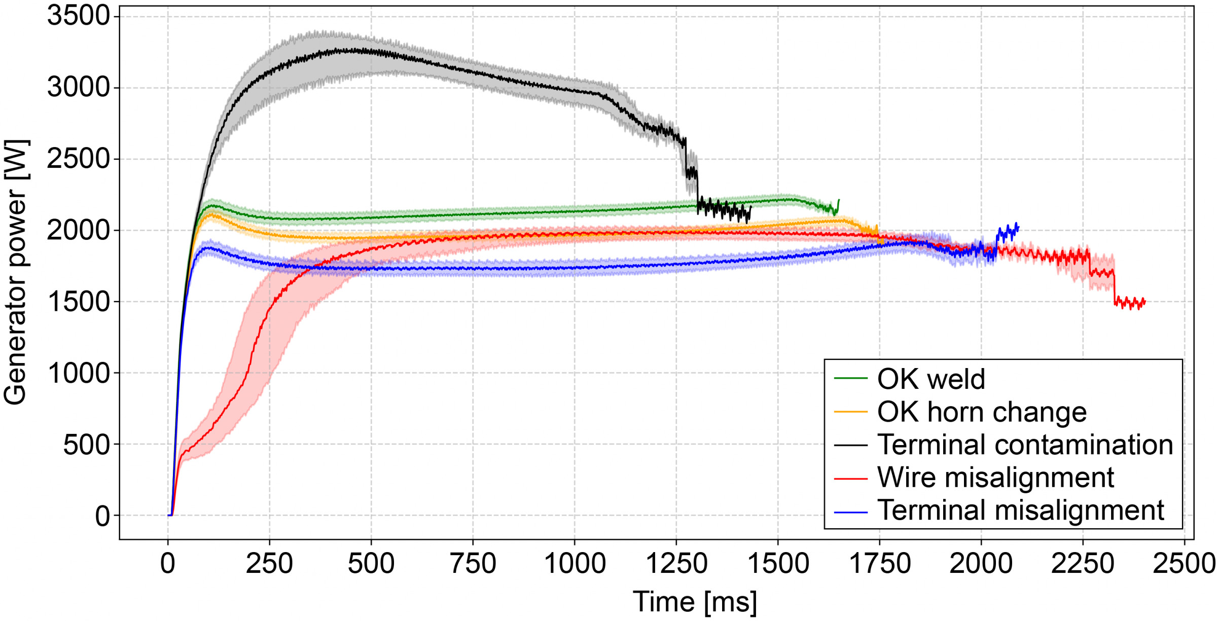 The evaluation shows that the highest pull-out forces, with a median value of 2,850.00 N, was achieved in the OK weld class. This class also exhibits the smallest range (610 N) and standard deviation (108.52 N), indicating high reproducibility and process stability. In contrast, the terminal contamination class shows a significantly lower median value of 247.66 N and a very high spread of 425.79 N. Notably, in a total of 59 cases within this class no pull-out force could be determined resulting from process errors that lead to complete failure of the connection. A visualization of the curve profiles, including the interquartile range of all welding curves in the dataset with respect to generator power and taking class affiliation into account, reveals that the individual welding curves within each class are fairly homogeneous, while there are significant differences between the welding classes, particularly in terms of the curves’ curvature and length, see Fig. 4.