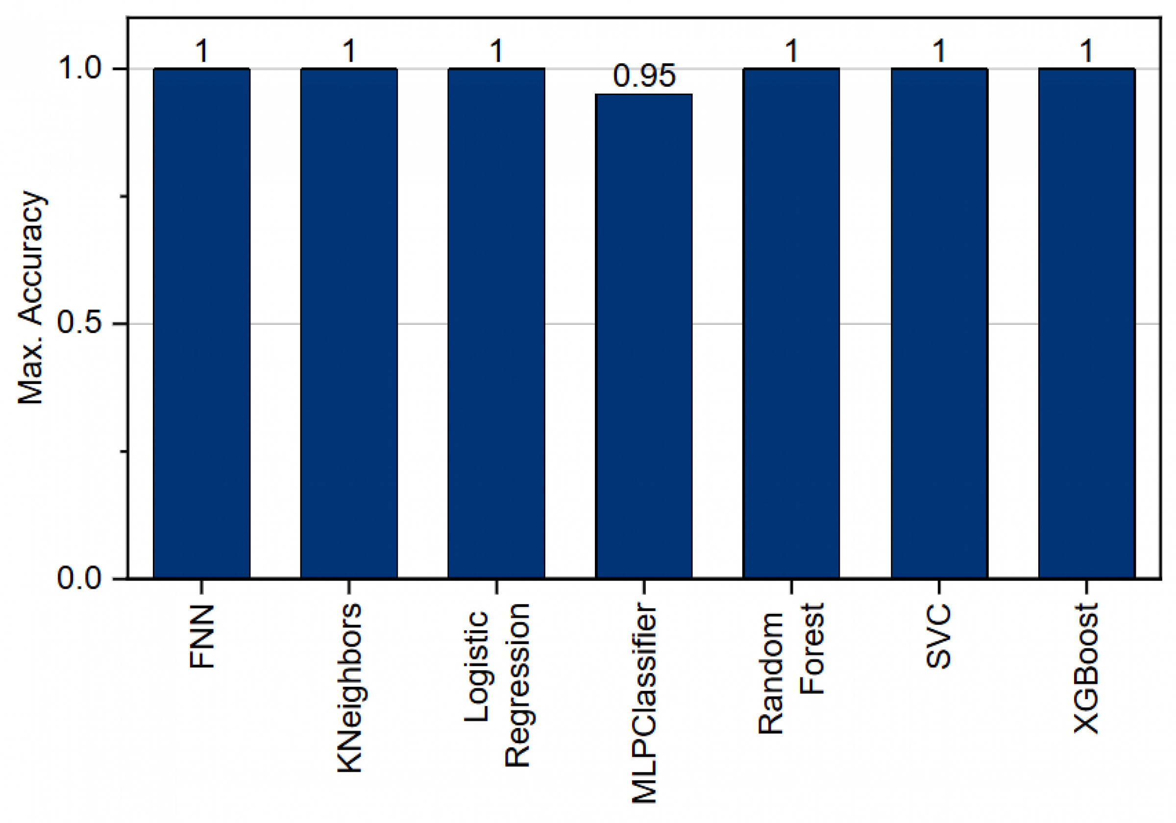 The use of cross-validation ensures that the results of both feature extraction strategies can be adequately evaluated with regard to the reduction of overfitting. With regard to the machine learning algorithms tested for the classification task, a direct comparison shows that, with the exception of the MPClassifier, all methods, after some tuning, were able to achieve 100 % accuracy (see Fig. 13).