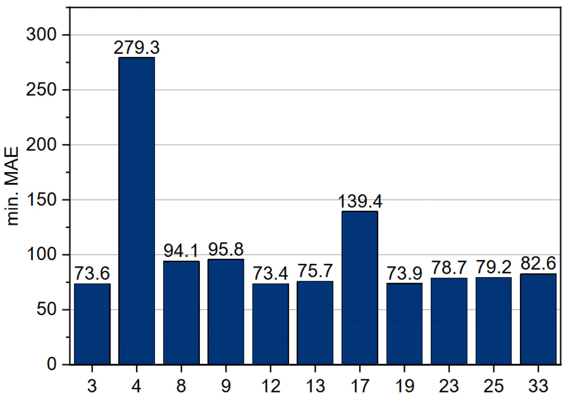 The results in using statistical features for predicting pull-out force exhibit somewhat more variability, but overall they are quite similar: using three statistical features yielded a minimum MAE of 73.6, while using 33 statistical features yielded a minimum MAE of 82.6, shown in Fig. 11.