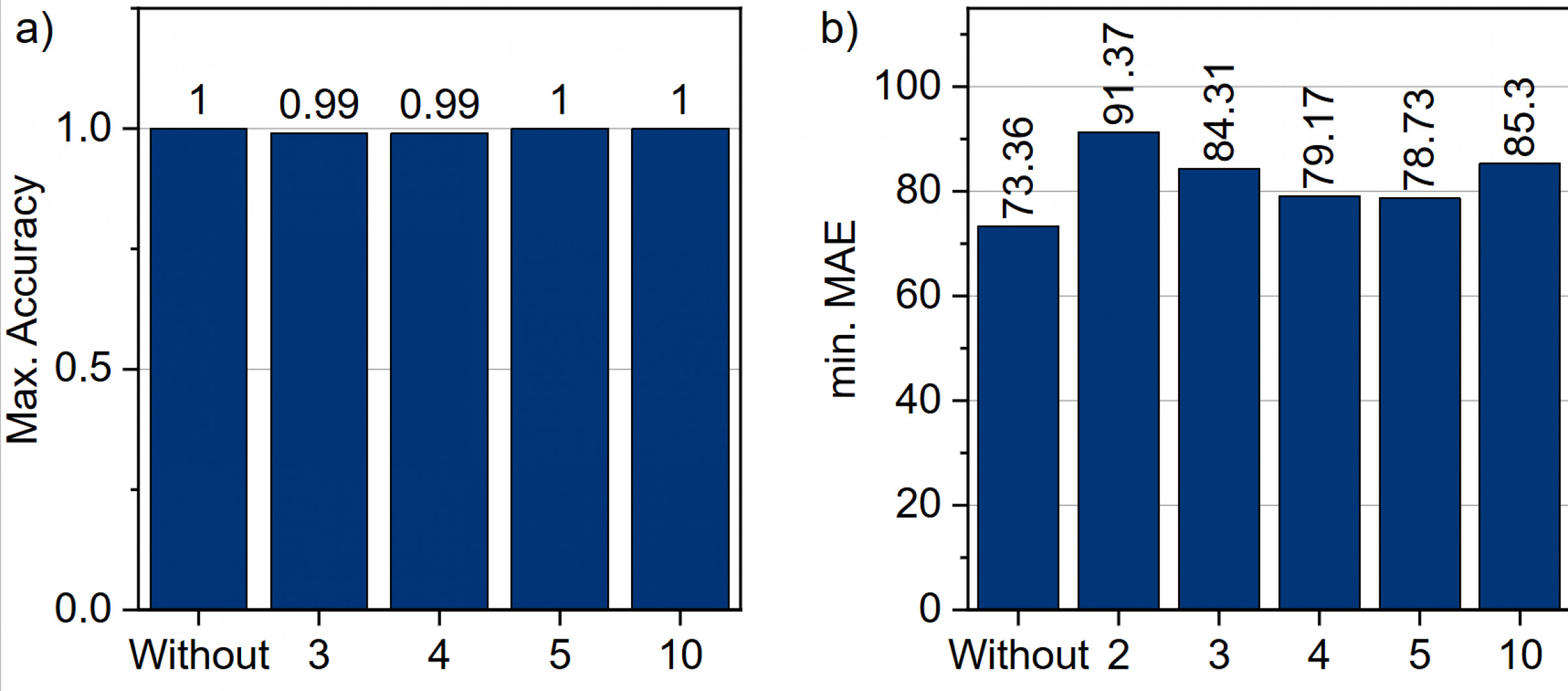 Within the raw data were welding curves whose pull-out force was recorded as 0. These values should not be interpreted as measurement errors or missing data but have a clear physical basis. They indicate that the joint came apart immediately after the welding process, so no pull-out force measurement could be carried out. To determine whether these curves influence the models, experiments were excluding curves with pull-out force = 0 were carried out. When comparing the two datasets (all data vs. without pull-out force = 0), there was generally an increase in MAE in the reduced sample of about 0.2 % to 9 %. This shows that datasets with a pull-out force of 0 also make a crucial contribution to the models’ learning. Overall, 21 models for predicting the welding classes achieve 100 % accuracy. Table 7 below provides a detailed overview of these models.
