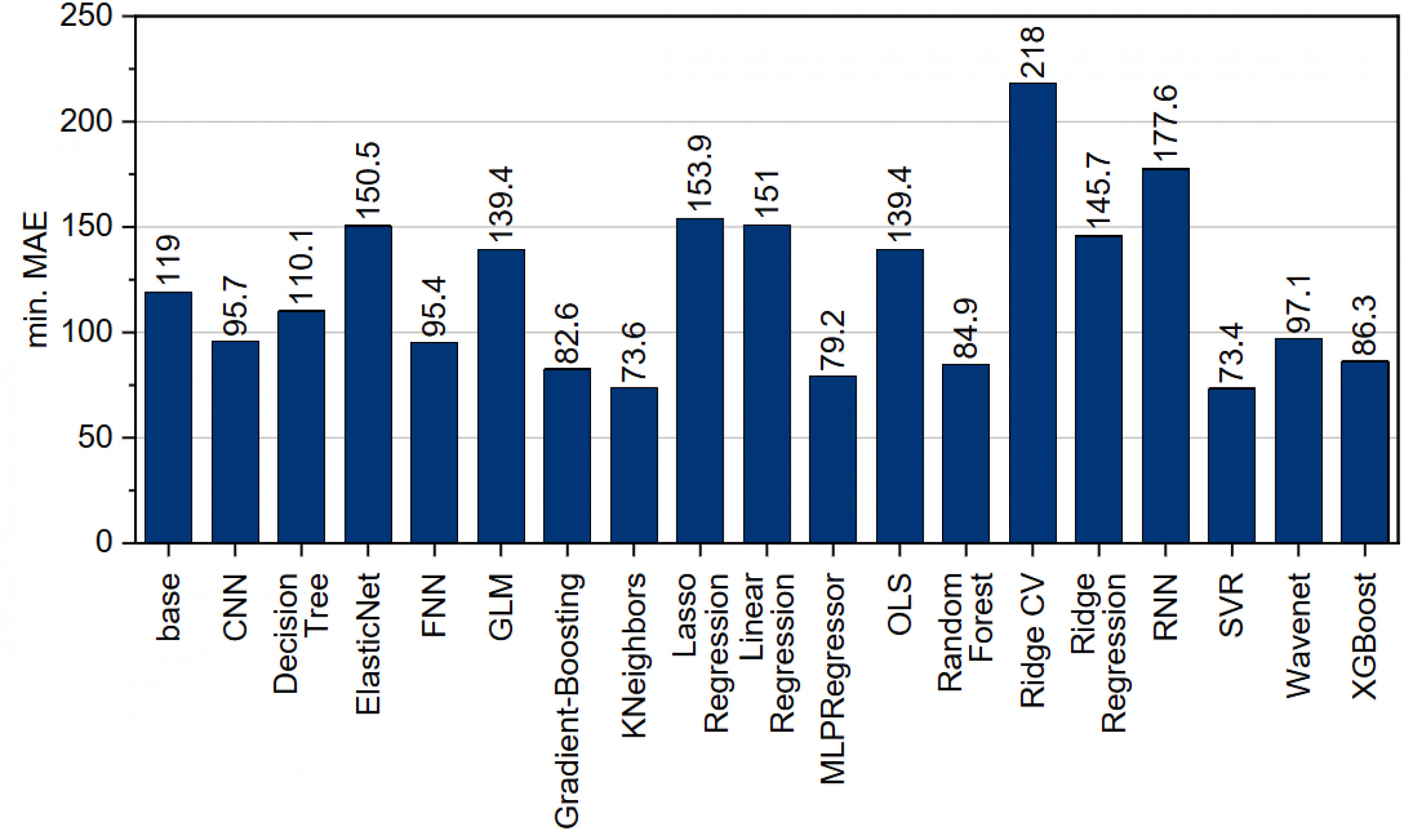 The best performance for predicting pull-out force was achieved by a support vector machine, with a minimum MAE of 73.4, closely followed by KNeighbors at 73.6 and an MLPRegressor at 79.2. The poorest results were obtained by RidgeCV, with a minimum MAE of 218.0, and the recurrent neural network, with a minimum MAE of 177.6. The MLPRegressor demonstrates excellent minimum MAE performance while exhibiting poor average results (see Fig 15). In contrast, RidgeCV shows weak minimum performance but consistent mid-range average predictions.