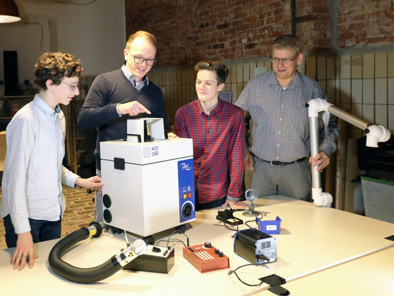 Die ULT AG übergab bereits am 17. Dezember 2019 zwei Absauganlagen, die im Makerspace für reine Luft sorgen sollen. So werden die Maschinenbediener und auch die Anlagen selbst vor dem gefährlichen Einfluss von Luftschadstoffen wie Gasen oder Dämpfen geschützt. Ein Gerät vom Typ LRA 160 wird zukünftig als Untertischgerät zur Lötrauchabsaugung eingesetzt. Am 3D-Drucker wurde die Absauglösung ACD 160.1 installiert, um entstehende Emissionen aus der Raumluft zu entfernen.